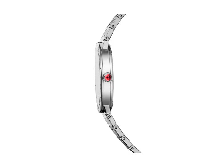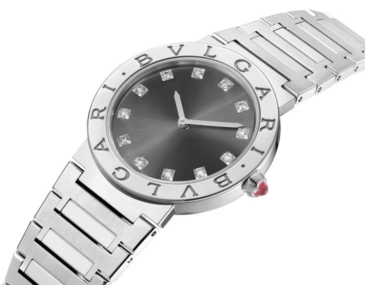 The timeless Bvlgari Bvlgari Lady watch embodies more than 40 years of bold creativity and distinctive style. In 1977, the Roman Maison launched the first Bvlgari Bvlgari Lady timepiece featuring the emblematic circular signature: from the very first moment this creation made its historic entrance into the exclusive circle of enduring watch models, beyond the reach of time. The double logo, inspired by the curved inscriptions on ancient Roman coins, epitomizes still today Bvlgari’s unparalleled ability to fuse culture and modernity into timeless creations. Bvlgari Bvlgari Lady watch with quartz movement, 33mm stainless steel case, stainless steel bezel with logo, stainless steel crown with a synthetic cabochon-cut rubellite, anthracite satiné soleil lacquered dial, diamond indexes and stainless steel bracelet.