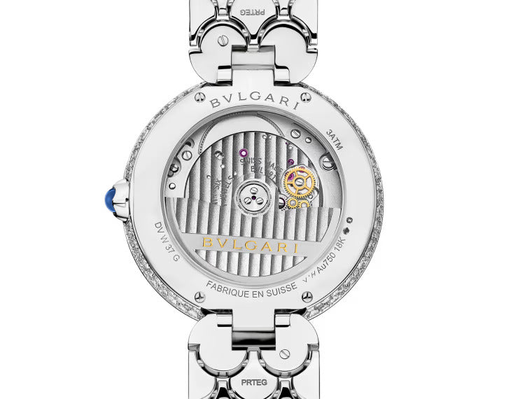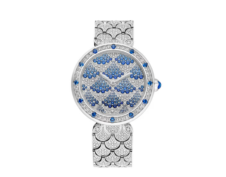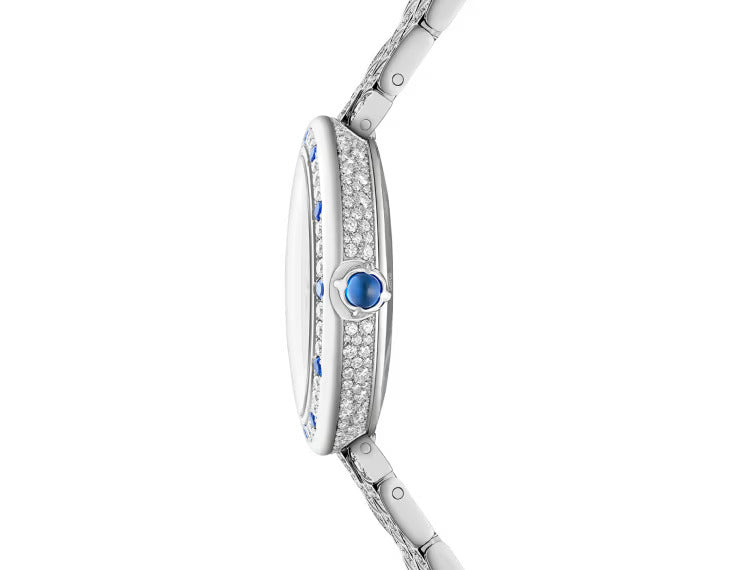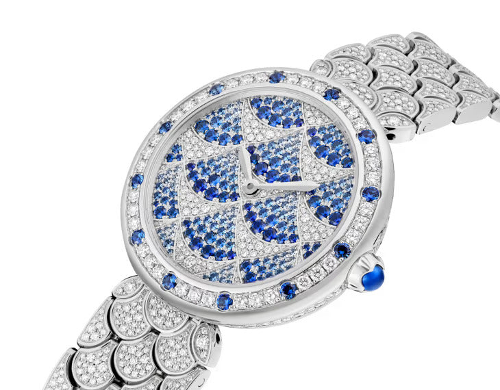 Divas' Dream Mosaica High Jewellery watch with mechanical manufacture movement, automatic winding, BVL191 calibre (3.8 mm thick), 42-hour power reserve, 28'800 Vph (4 Hz) frequency, 37 mm 18 kt white gold case and bezel set with brilliant-cut diamonds (~2.2 ct) and blue sapphires (~0.6 ct), fan-shaped snow-set diamond (~0.4 ct) and blue sapphire (~2.10 ct) dial, white gold hands, 18 kt white gold crown set with a cabochon-cut blue sapphire (~0.3 ct), 18 kt white gold fan-shaped bracelet set with diamonds (~5.1 ct). Water-resistant up to 30 metres.