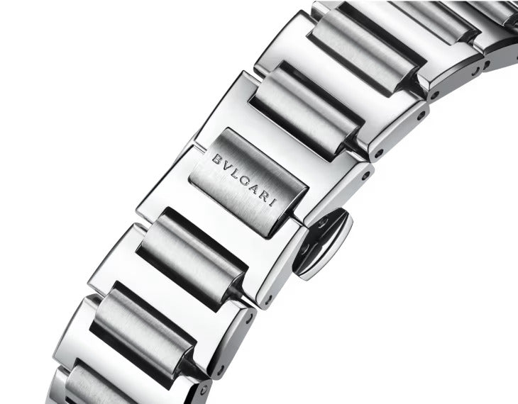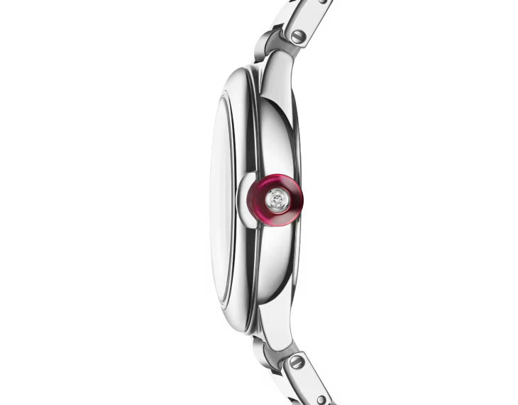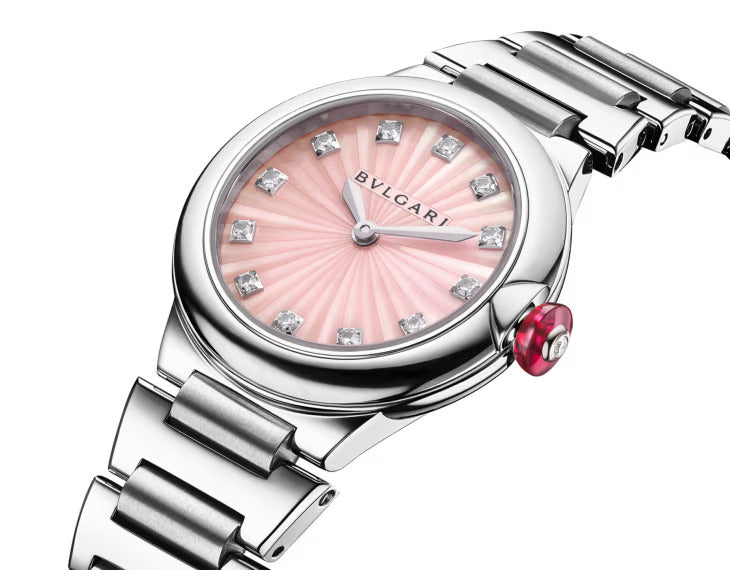 A symbol of radiant and modern femininity, the Lvcea watch brings a touch of glamour to your style and everyday life. Infused with exceptional artistry, this stainless steel watch displays the integral bond between Bvlgari’s jewellery savoir-faire and watchmaking expertise. Its three-dimensional dial, illuminated by diamond indexes, is meticulously crafted with pink mother-of-pearl elements, faceted and assembled one by one to evoke the rays of the sun - an exquisite tribute to the classic métiers d’art technique inspired by intarsia.