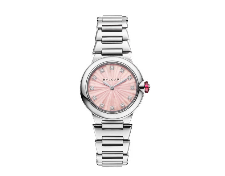 Lvcea watch with quartz movement, hour and minute functions, 28 mm polished stainless steel case, pink mother-of-pearl marquetery dial, 12 round brilliant-cut diamond indexes, stainless steel crown set with a synthetic cabochon-cut pink sapphire and a diamond, polished and satin-brushed stainless steel bracelet with folding buckle. Water-resistant up to 50 metres.