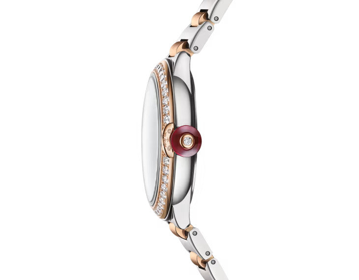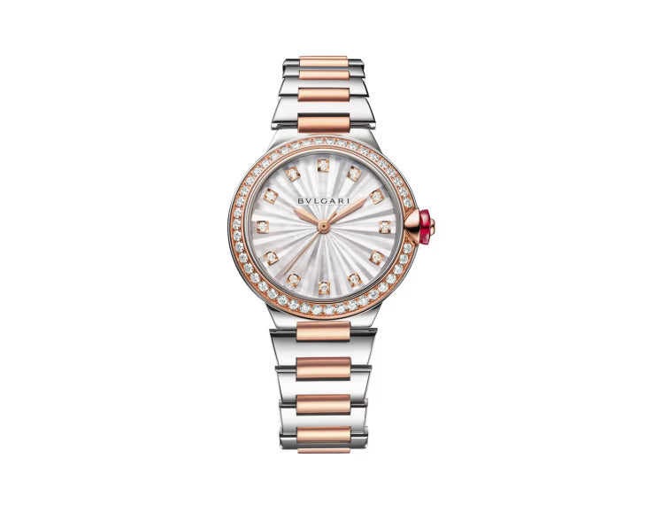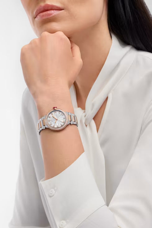 Lvcea watch with automatic movement, hours, minutes and seconds functions, 33 mm polished stainless steel case, 18 kt rose gold bezel set with round brilliant-cut diamonds, white mother-of-pearl intarsio dial, 12 round brilliant-cut diamond indexes and cabochon-cut synthetic pink sapphire crown set with a diamond. 18 kt rose gold and polished, satin-brushed stainless steel bracelet with folding buckle. Water-resistant up to 50 metres.