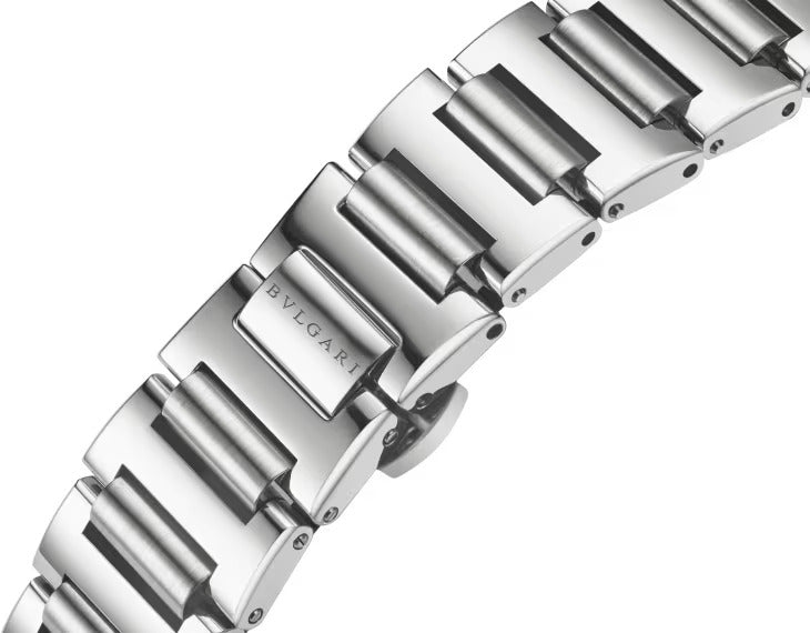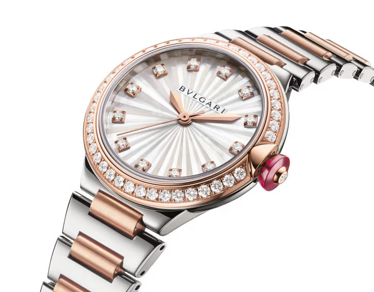 A symbol of radiant and modern femininity, the Lvcea watch brings a touch of glamour to your style and everyday life. Infused with exceptional artistry, this timepiece with polished steel case and diamond-set 18 kt rose gold bezel displays the integral bond between Bvlgari’s jewellery savoir-faire and watchmaking expertise. Its three-dimensional dial, embellished with diamond indexes, is crafted with white mother-of-pearl elements, faceted and assembled one by one to evoke the rays of the sun, using a classic métiers d’art technique inspired by “marquetry”. A bracelet in 18 kt rose gold and polished, satin-brushed steel completes the model.