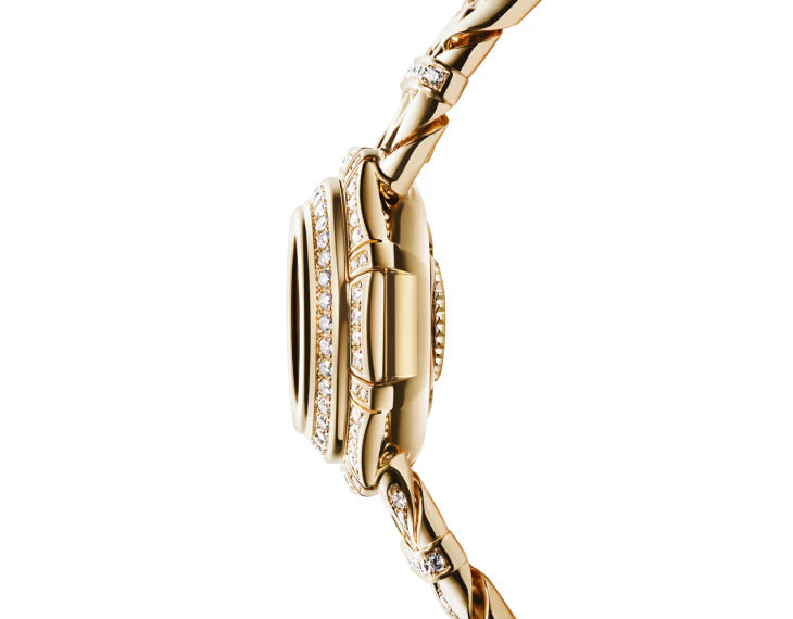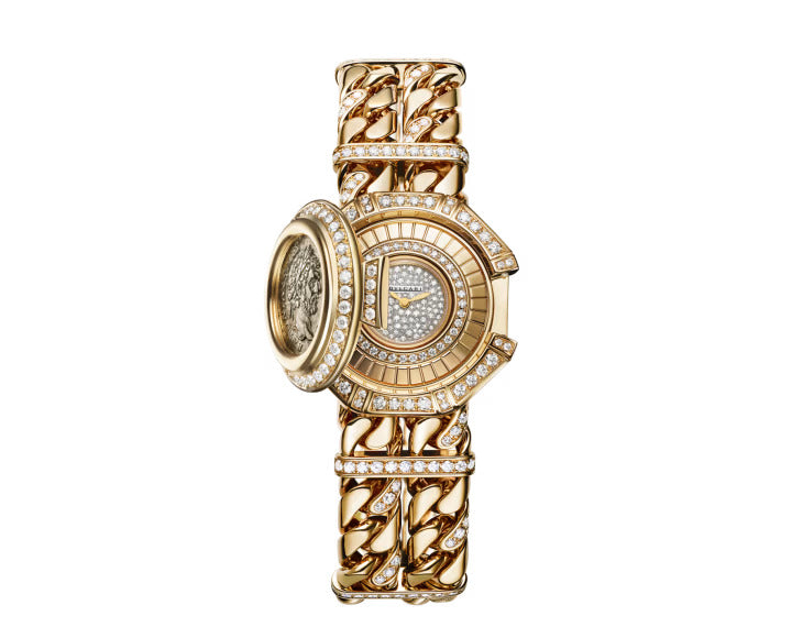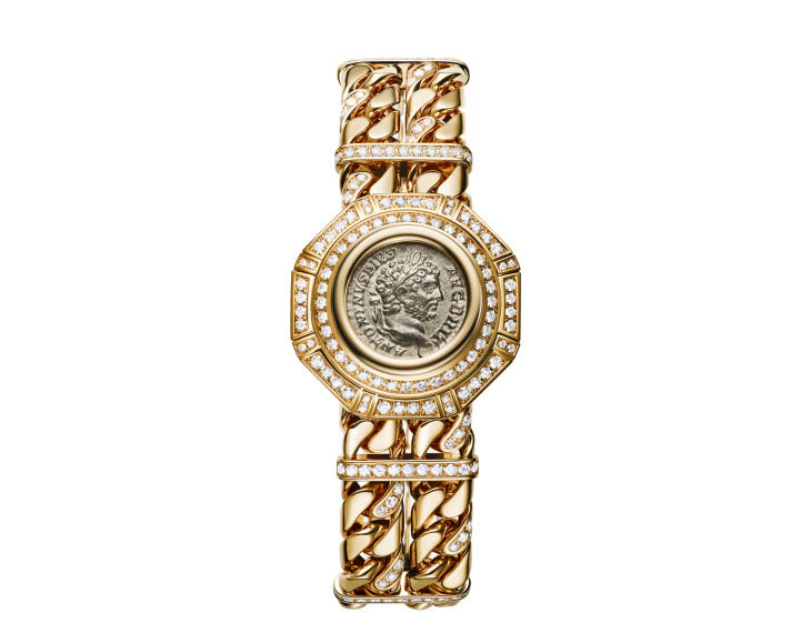 Passionate about combining features of Rome's Imperial glory with its contemporary aesthetics, Bvlgari began incorporating 2,000-year-old coins into its creations as early as the 1960s, propelling its unique heritage into eternal modernity. In keeping with this legacy, the Monete Catene High Jewellery secret watch in 18 kt yellow gold features a silver coin bearing the effigy of Emperor Caracalla, who ruled from 198 to 217 AD. Powered by the Piccolissimo in-house micro movement, the timepiece combines an octagonal diamond-set case with a supple bracelet made of two gold chains embracing the wrist, while a full pavé diamond dial is hidden under the cover.