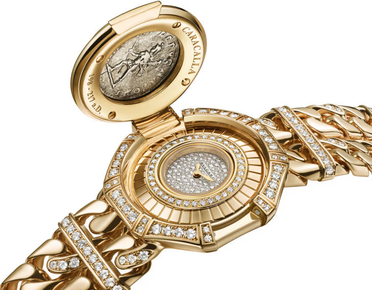 Monete Catene High Jewellery secret watch with Piccolissimo mechanical manufacture micro-movement, manual winding (2.5 mm thick), 30-hour power reserve, frequency 21'600 Vph (3Hz), 18 kt yellow gold case set with round brilliant-cut diamonds, 18 kt yellow gold cover set with a silver denarius coin featuring emperor Caracalla (198-217 AD), full pavé diamond dial, yellow gold-plated hands and 18 kt yellow gold chain bracelet set with diamonds.