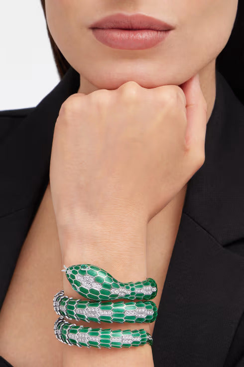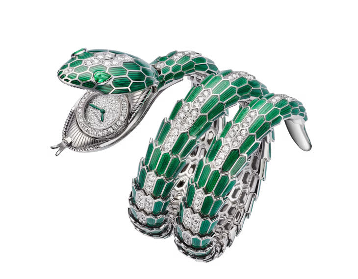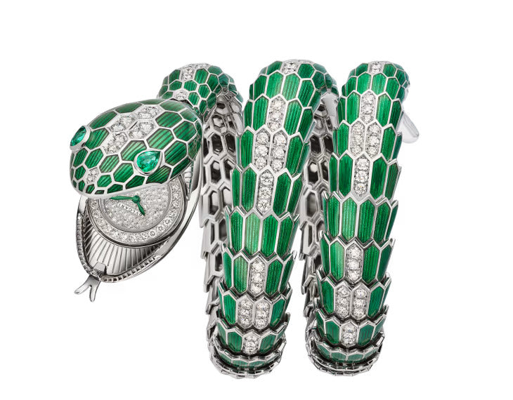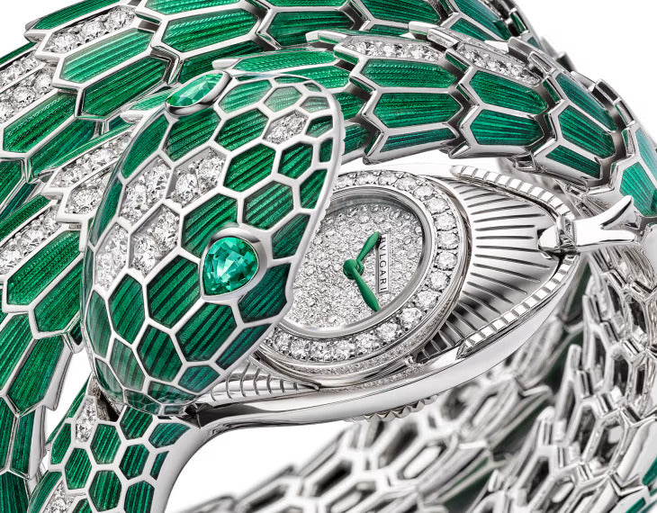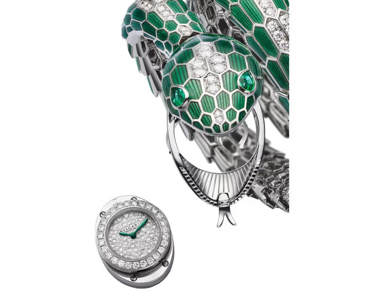 Serpenti Misteriosi High Jewellery secret watch with mechanical manufacture micro-movement with manual winding, BVL 100 calibre (2.5 mm thick), 30-hour power reserve and 21,600 vph (3 Hz) frequency. 40 mm 18 kt white gold case and bracelet embellished with green lacquer, brilliant-cut diamonds and two pear-cut emeralds for the eyes, with pavé-set diamond dial.
