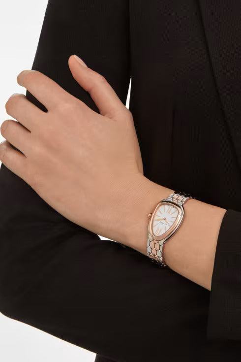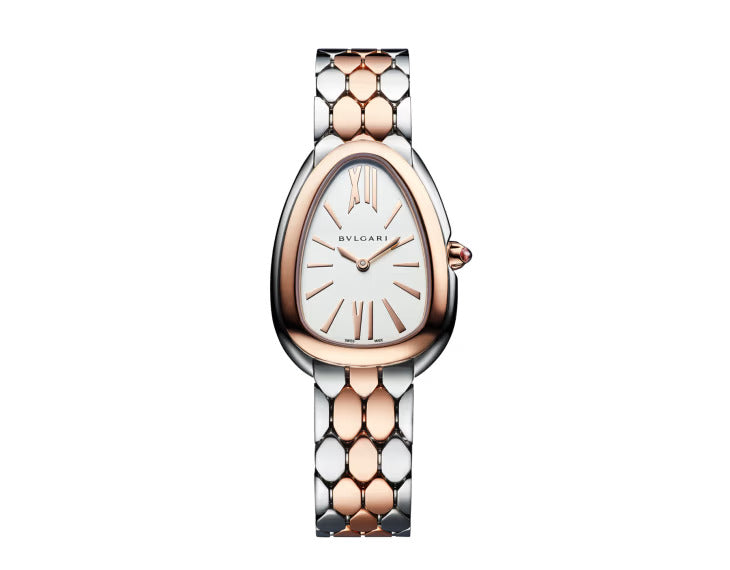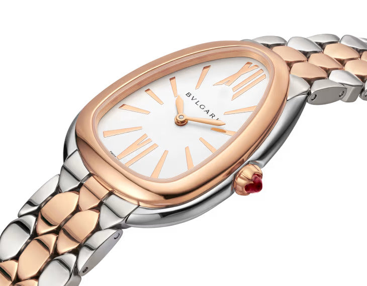 Serpenti Seduttori watch with quartz movement, 33 mm stainless steel case, 18 kt rose gold bezel, 18 kt rose gold crown set with a cabochon-cut pink rubellite, white silver opaline dial, 18 kt rose gold and stainless steel bracelet. Water-resistant up to 30 metres.