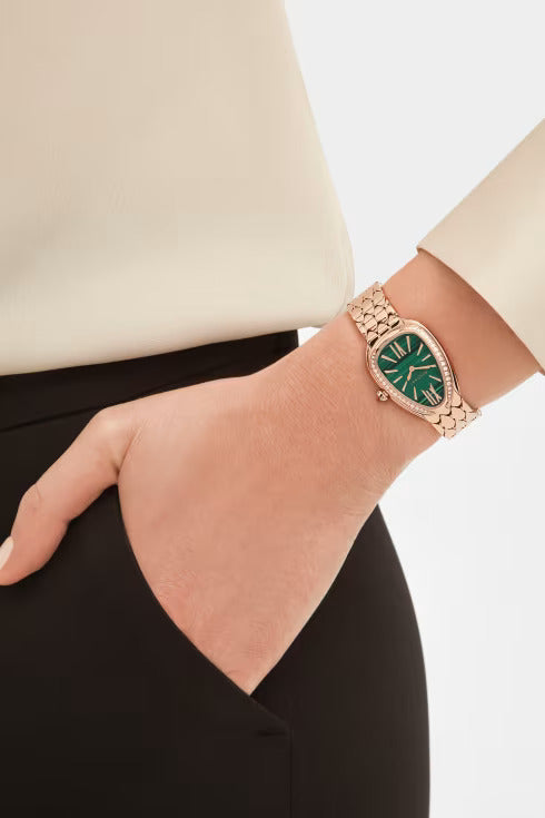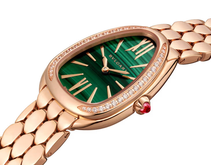 Serpenti Seduttori watch with quartz movement, 33 mm 18 kt rose gold case set with diamonds, 18 kt rose gold crown set with a cabochon-cut pink rubellite, malachite dial and 18 kt rose gold bracelet. Water-resistant up to 30 metres.