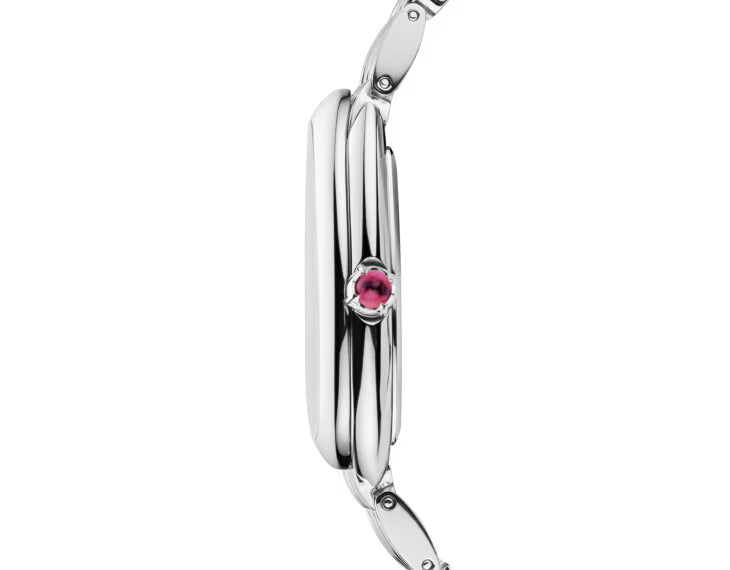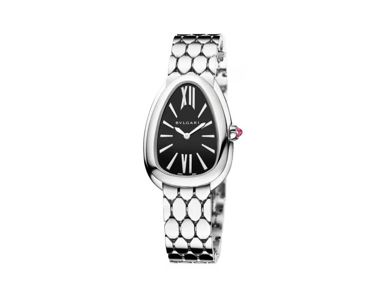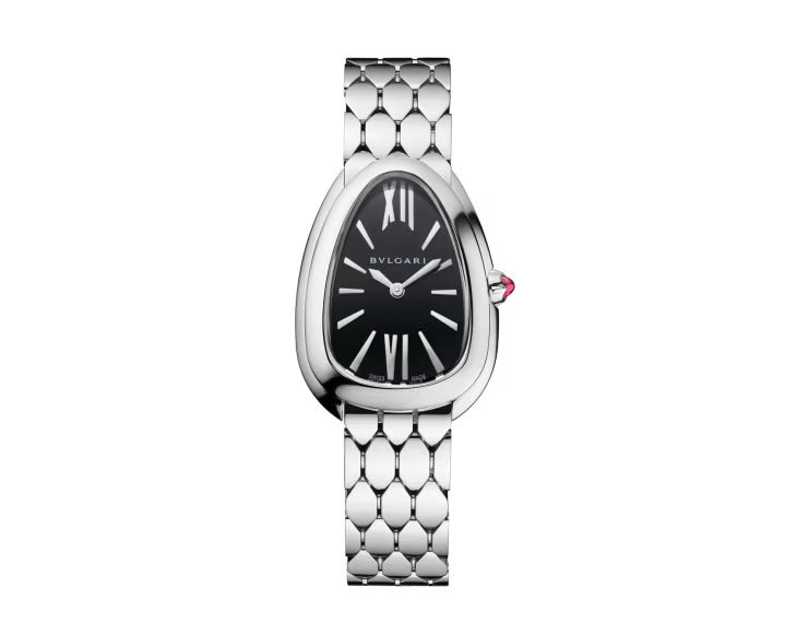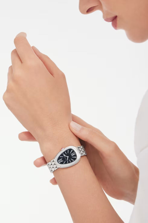 Gleaming with the refined sheen of its materials, the Serpenti Seduttori watch in stainless steel is an irresistible blend of sensuality, mystery and contemporary glamour. With its black lacquered dial, framed by the distinctive drop shaped watch head, the timepiece boasts an alluring game of contrasts. Inspired by the serpent's scales, the flexible and enveloping bracelet features a hexagonal pattern, sealing the perfect encounter between the world of jewellery and watchmaking. Serpenti Seduttori watch with quartz movement, 33 mm stainless steel case and bezel, stainless steel crown set with a cabochon-cut pink rubellite, black lacquered dial, stainless steel bracelet with folding buckle. Water-resistant up to 30 metres.