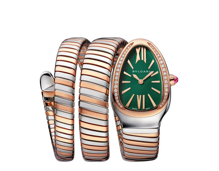 Merging two of the most iconic aesthetic signatures of Bvlgari’s creativity, the Serpenti Tubogas double-spiral watch in 18 kt rose gold and stainless steel combines the sinuosity of the snake with the contemporary soul of Tubogas. The head of the mythical animal is rendered by a diamond-set case and a green lacquered soleil dial, while the mesmerising suppleness of the bracelet evokes the fluid lines of the serpent's curving and intertwining body. An enchanting fusion of magnetic charm and legendary jewellery mastery.