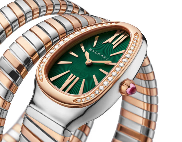 Serpenti Tubogas watch with quartz movement, hours and minute functions, 35 mm stainless steel case, 18 kt rose gold bezel set with round brilliant-cut diamonds, green lacquered soleil dial with guilloché soleil treatment, 18 kt rose gold crown set with a cabochon-cut rubellite and double-spiral bracelet in 18 kt rose gold and stainless steel. Water-resistant up to 30 metres.