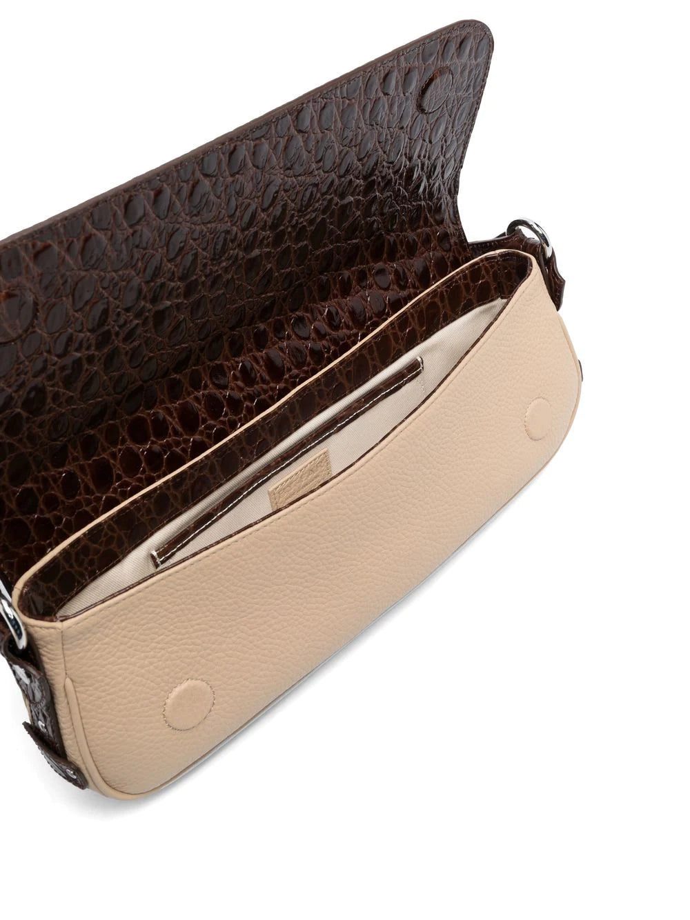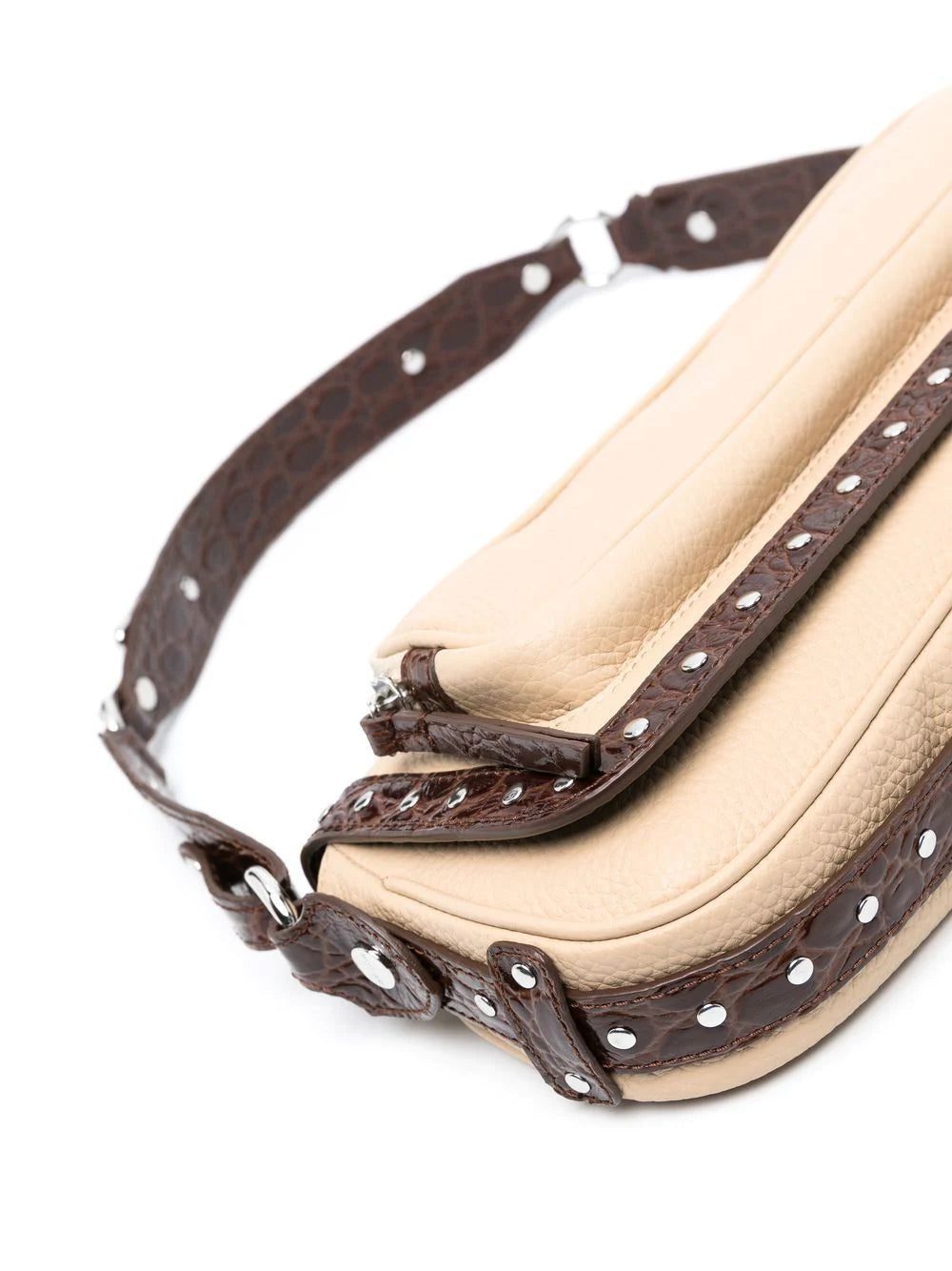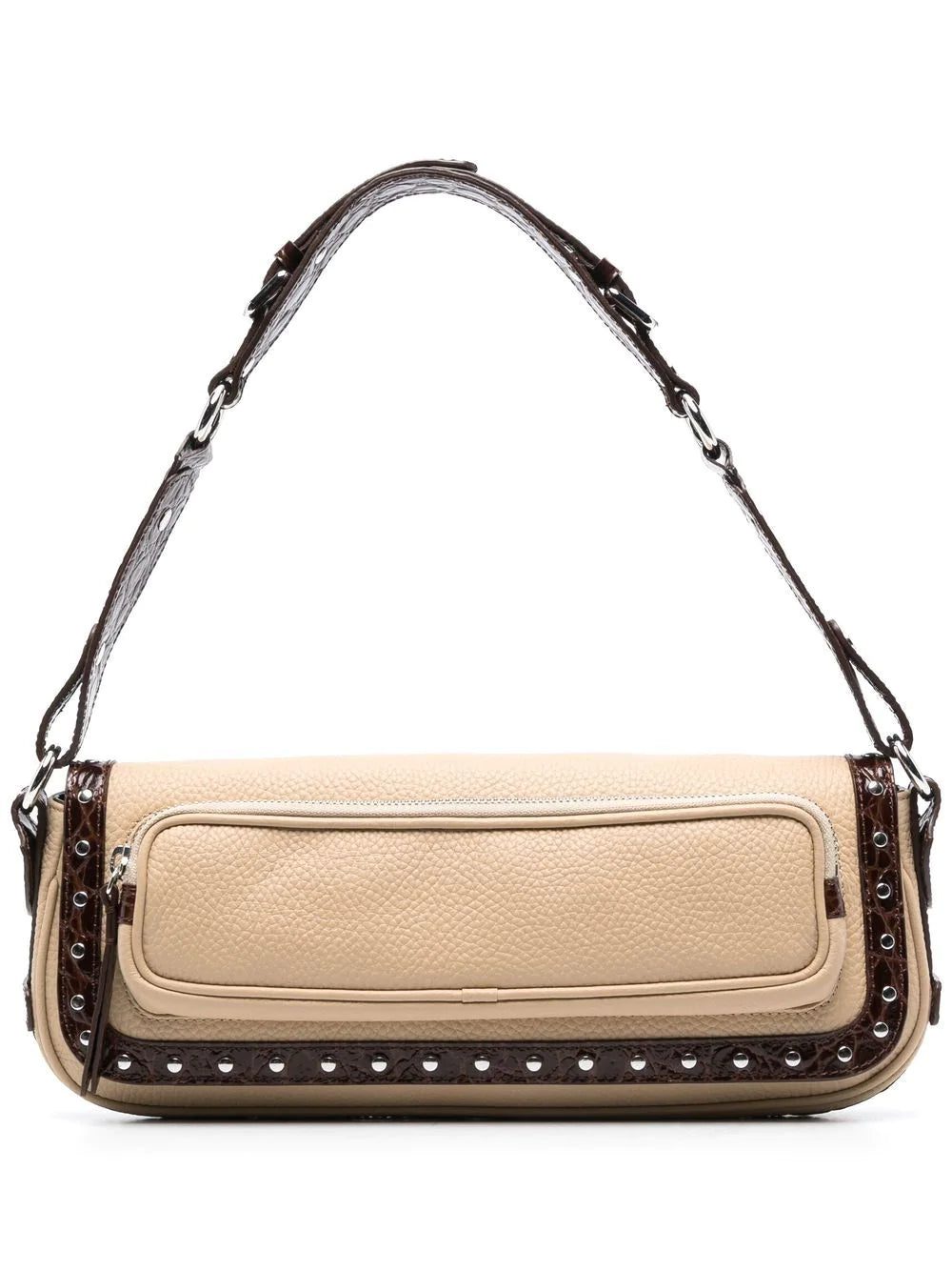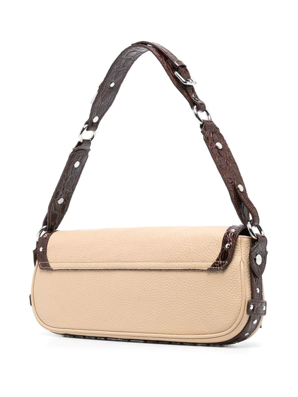 Maddy grained shoulder bag from BY FAR featuring beige, brown, calf leather, silver-tone stud embellishment, grained texture, foldover top with magnetic fastening, crocodile-effect embossed leather strap, buckle-detail shoulder strap, main compartment, front zip-fastening pocket and internal slip pocket.