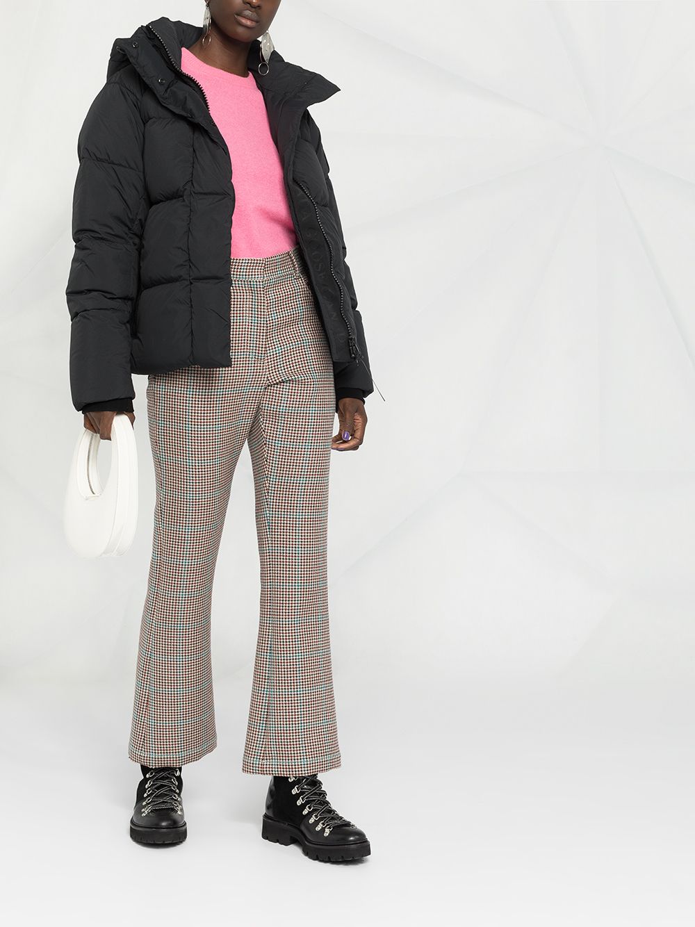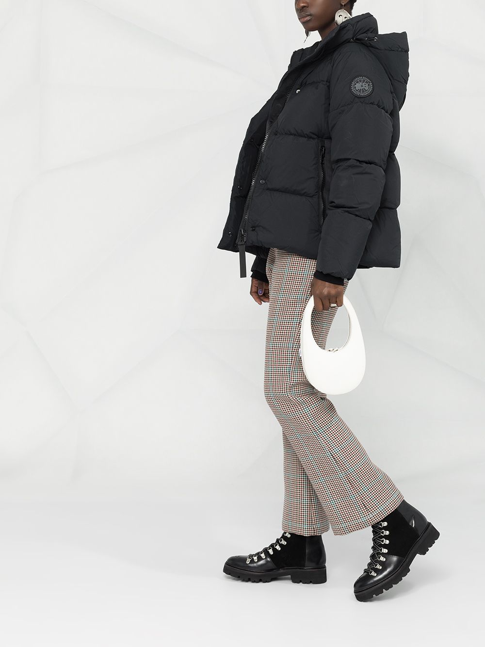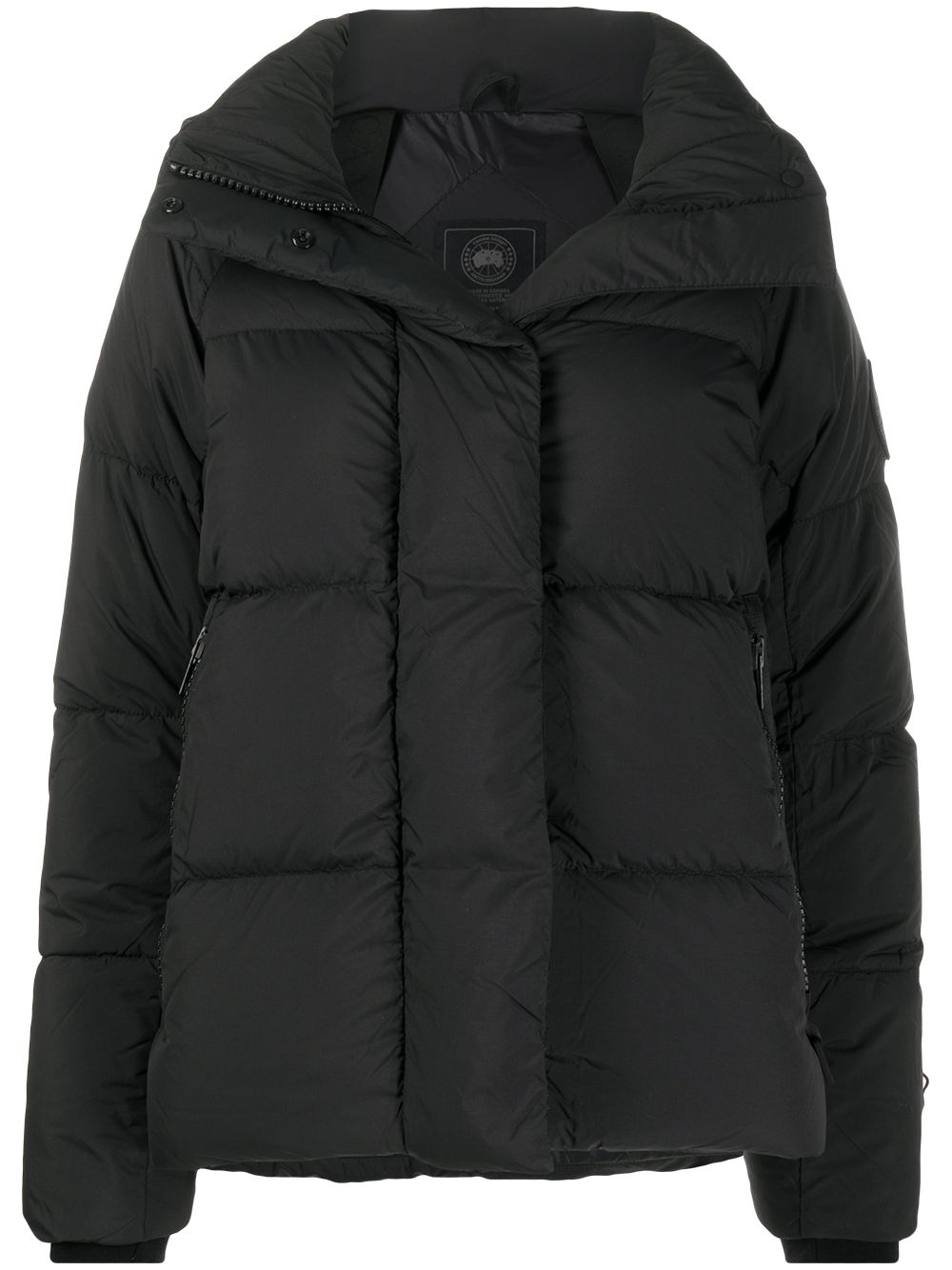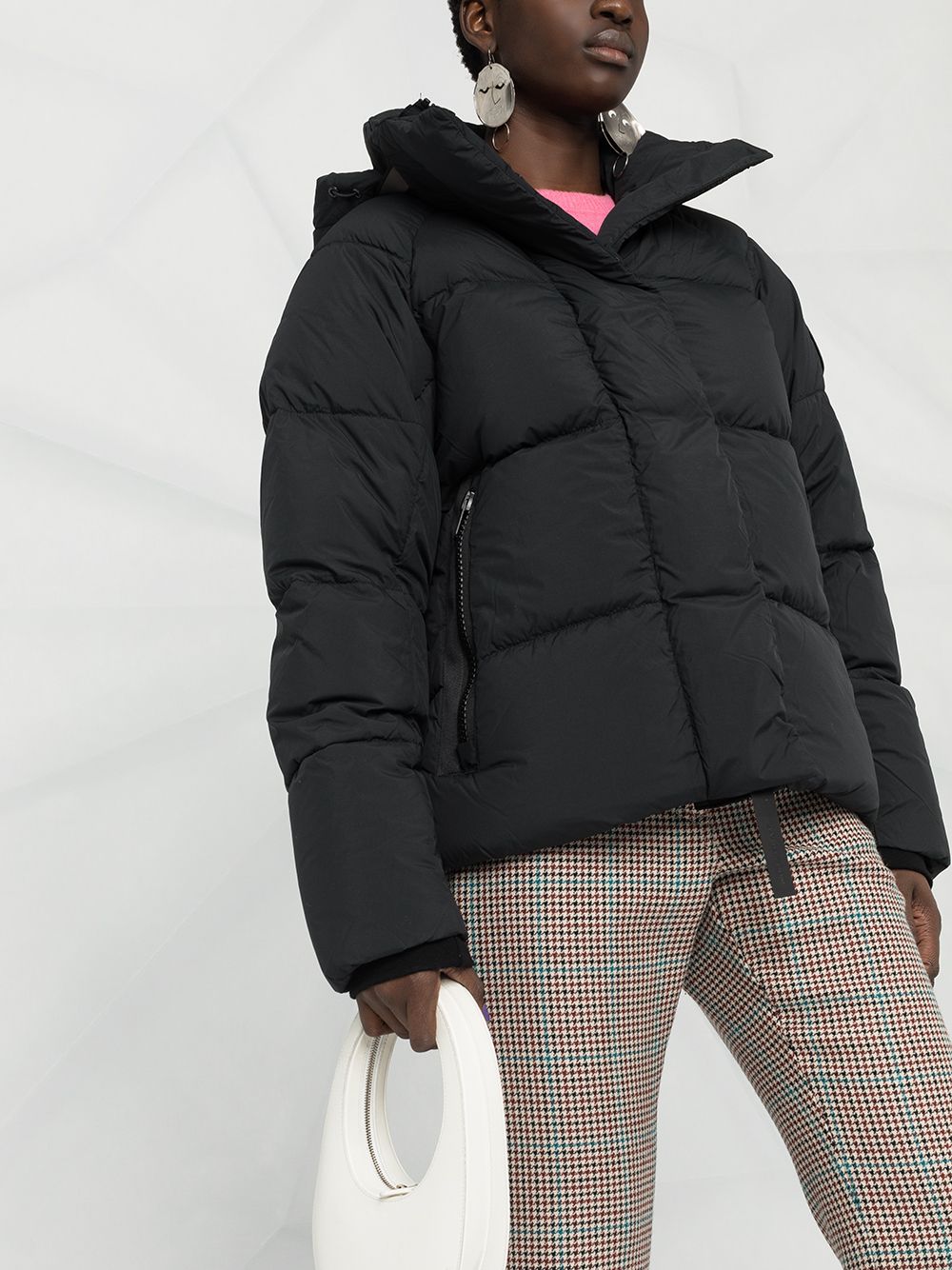 black nylon/feather down detachable hood padded design front zip fastening two side zip-fastening pockets long sleeves logo patch at the sleeve ribbed cuffs adjustable shoulder straps reflective detailing