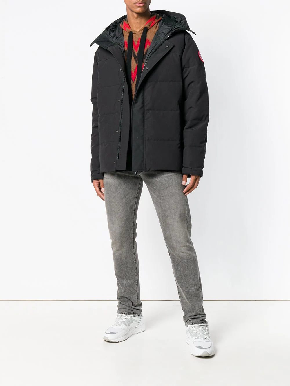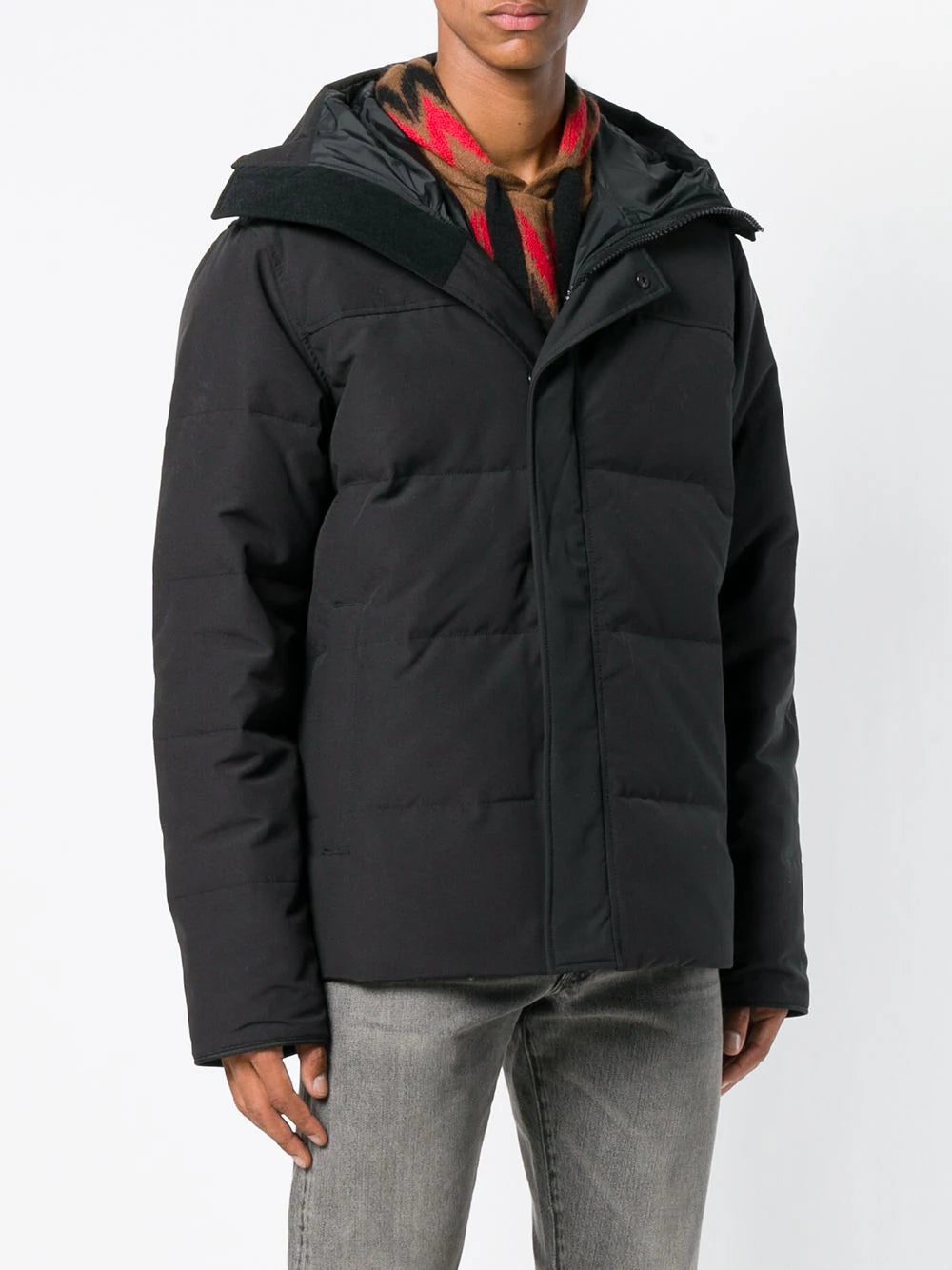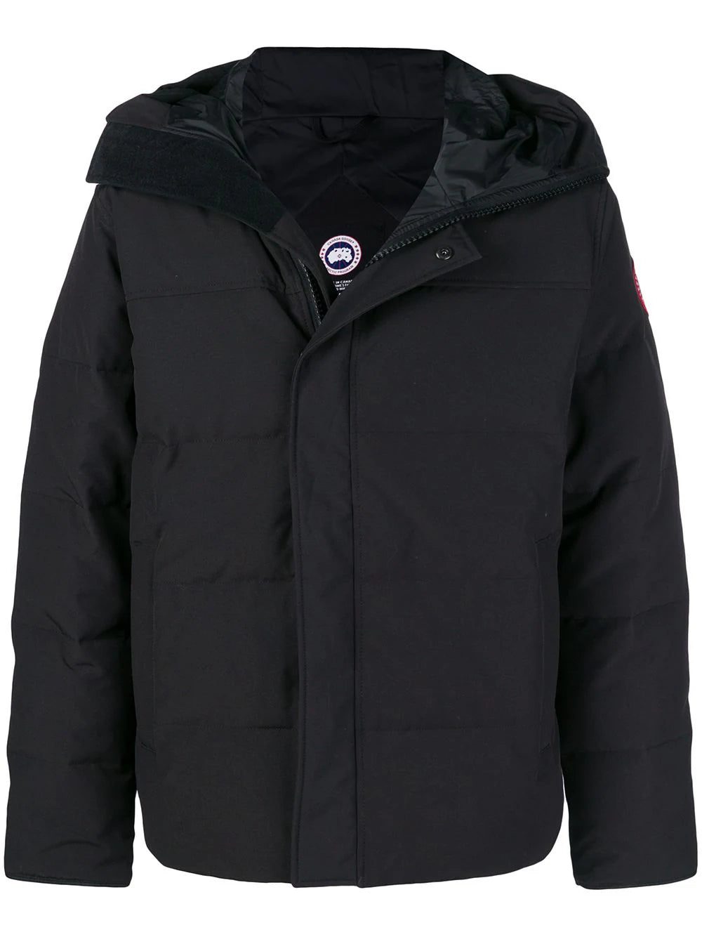 Black feather down MacMillan parka coat from Canada Goose featuring a hood, a concealed front fastening, a logo to the arm, long sleeves, side pockets, a padded interior and a Canada Goose logo patch.