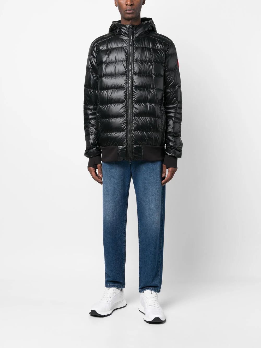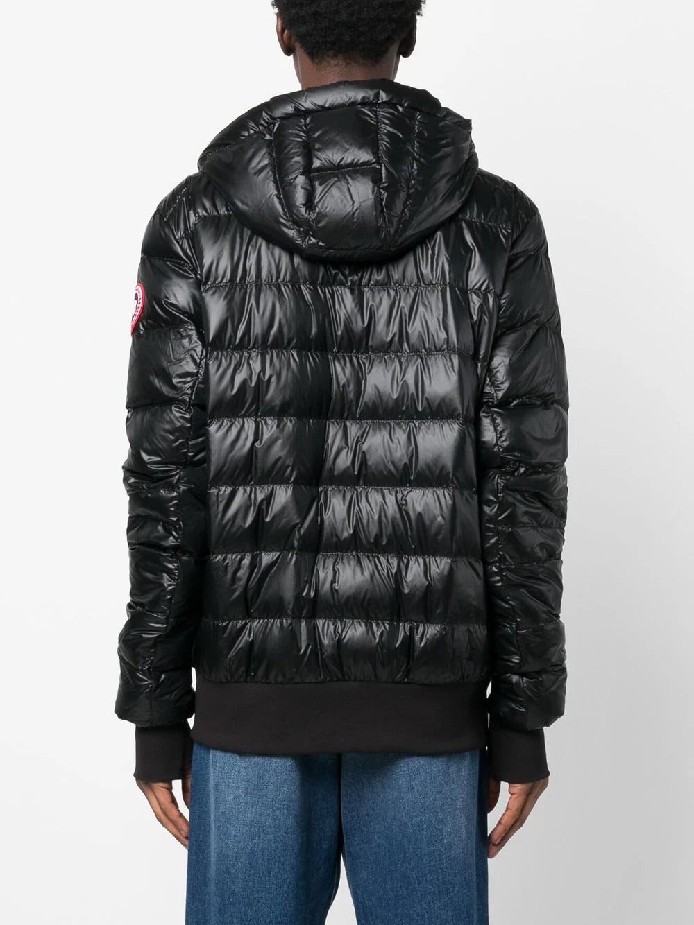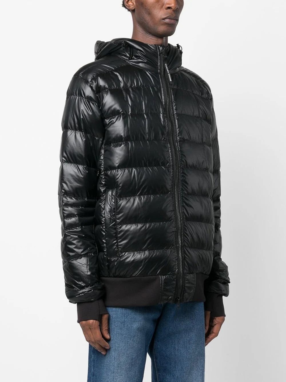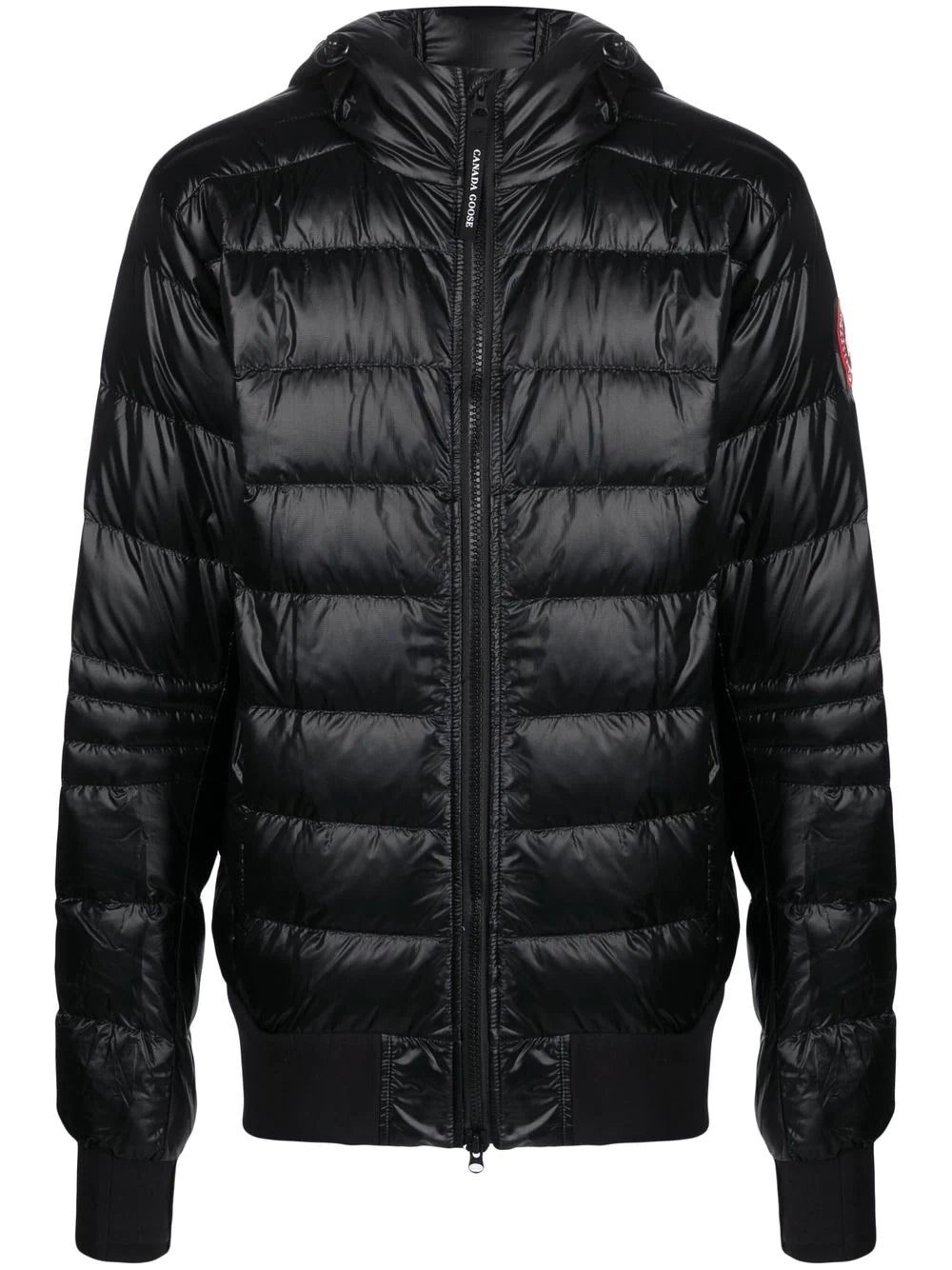 patent finish padded jacket from CANADA GOOSE featuring black, duck down, duck feather, front zip fastening, thumb slot, two side welt pockets, classic hood, tonal stitching, straight hem and logo-tape detailing to the rear.