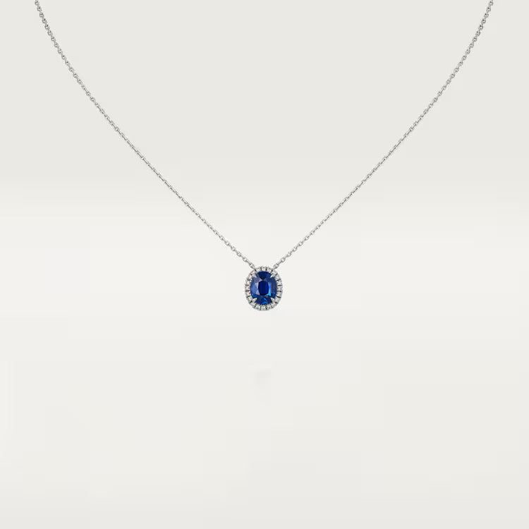 Cartier Destinée necklace, platinum 750/1000, set with an oval-cut sapphire available from 1.00 to 1.99 carats, and paved with brilliant-cut diamonds.