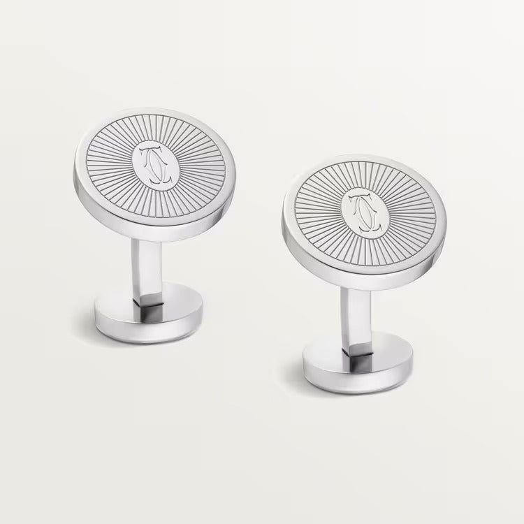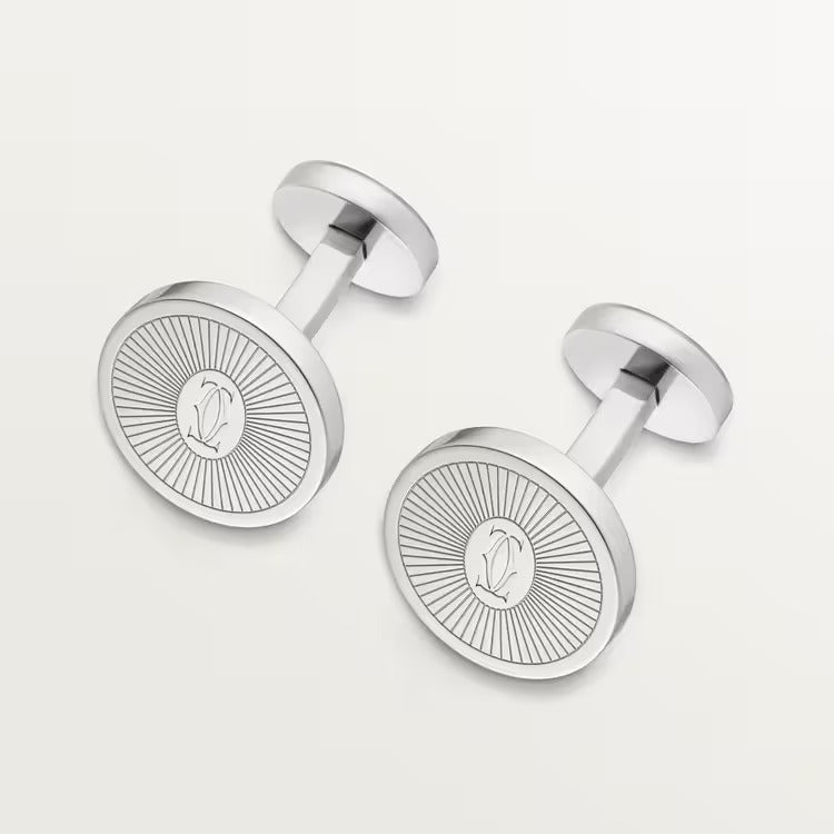 Double C de Cartier logo cufflinks with Sunray motif in palladium-finish sterling silver 925/1000. Head dimensions: 16 mm