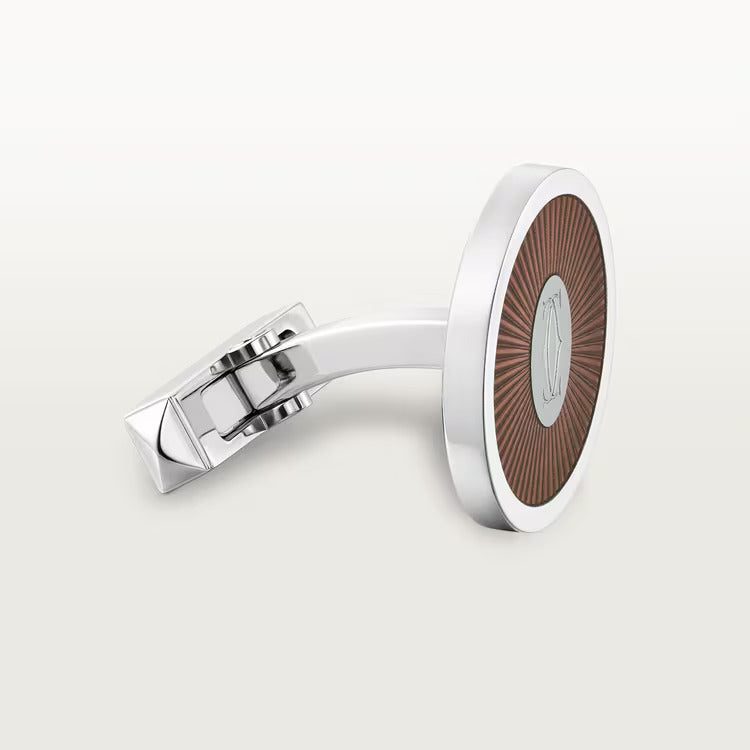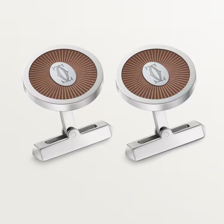 Double C de Carter logo cufflinks with Sunray motif in sterling silver 925/1000, palladium finish, translucent brown lacquer.