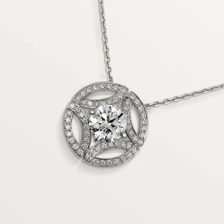 Galanterie de Cartier necklace, white gold 750/1000, set with a brilliant-cut diamond available in 0.30 to 0.34 carats, 0.50 to 0.59 carats, 1.00 to 1.15 carats and 1.50 to 1.69 carats, and paved with brilliant-cut diamonds.