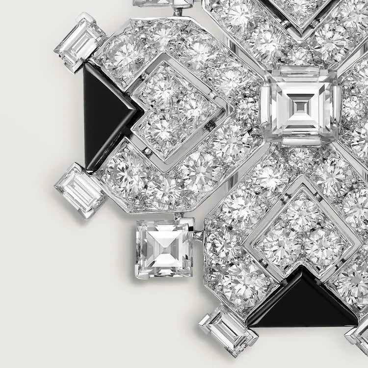 Art Deco-inspired brooch, white gold (750/1000), onyx, set with 5 square-cut diamonds totaling 1.39 carats, 8 baguette-cut diamonds totaling 0.57 carat and 48 brilliant-cut diamonds totaling 2.25 carats.
