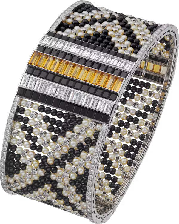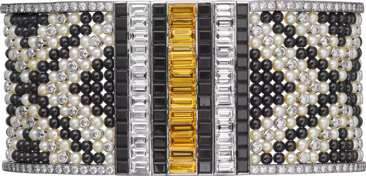 Bracelet - platinum 950/1000, 244 white cream natural pearls totaling 93.03 grains, baguette-cut orange tourmalines, onyx, baguette-cut diamonds, brilliant-cut diamonds.