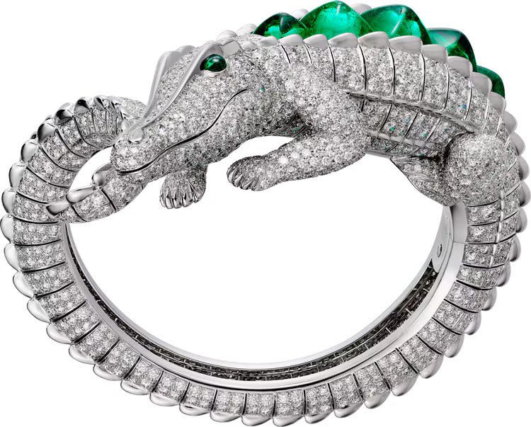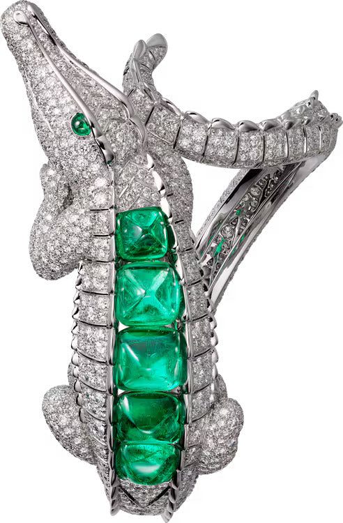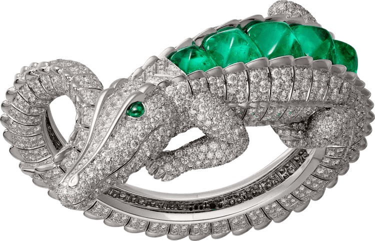 Bracelet - white gold 750/1000, five cabochon-cut emeralds from Colombia totaling 18.89 carats, emerald eyes, brilliant-cut diamonds.