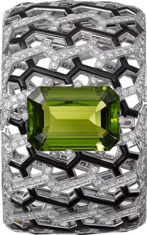 Bracelet - white gold (750/1000), one 34.66-carat rectangular-shaped peridot, black lacquer, brilliant-cut diamonds