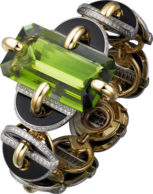 Platinum, yellow gold (750/1000), one 55.91-carat emerald-cut peridot, onyx, brilliant-cut diamonds.