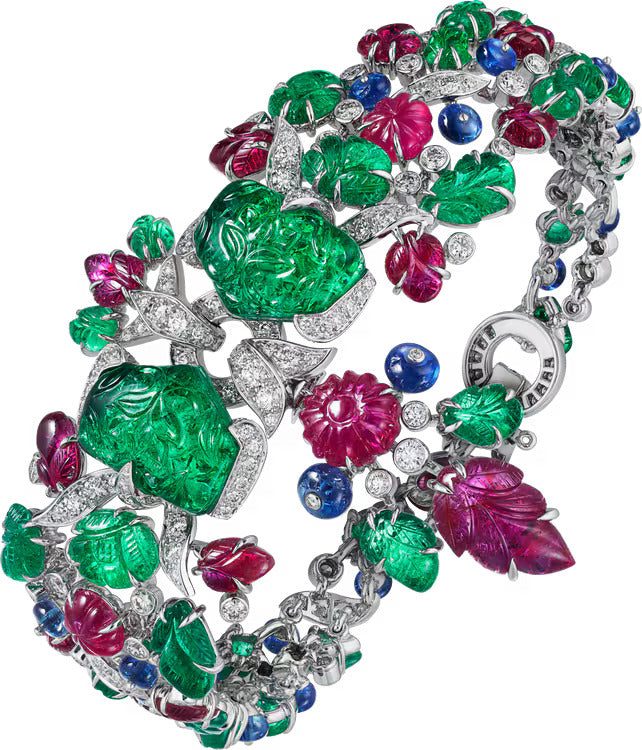 Bracelet - platinum, two fancy-shaped carved emeralds from Zambia totalling 12.45 carats, carved emeralds and rubies, melon-cut rubies, sapphire beads, brilliant-cut diamonds.