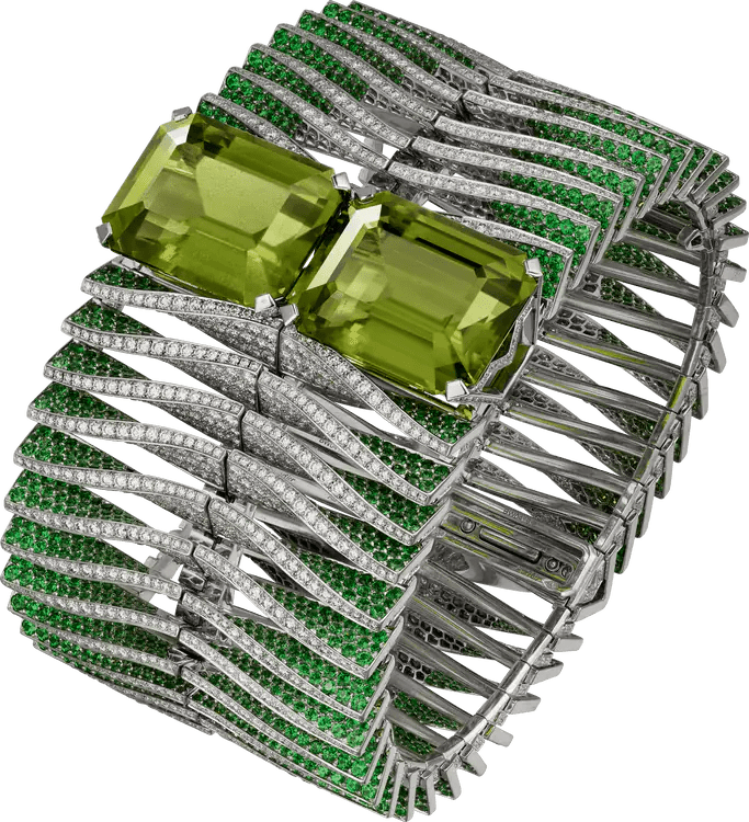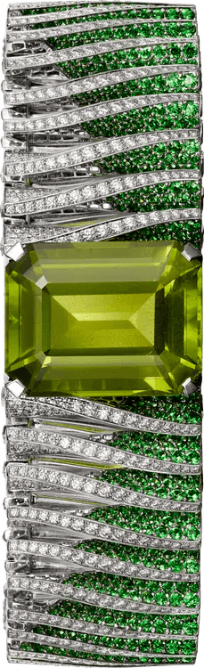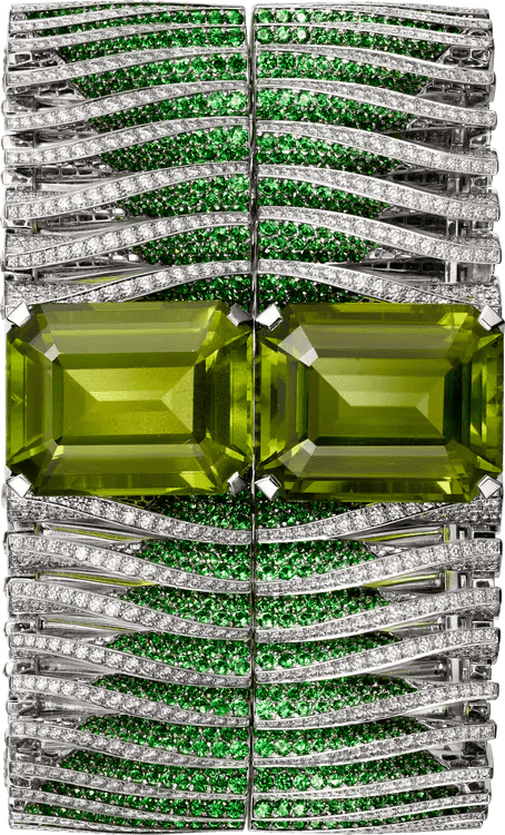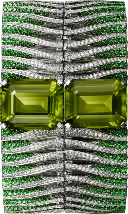 Bracelet - white gold (750/1000), two rectangular-shaped corner-cut peridots totaling 64.59 carats, tsavorite garnets, brilliant-cut diamonds. The two bracelets can be worn together or separately.