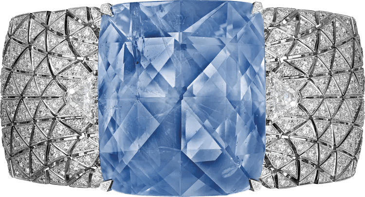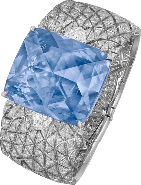 Bracelet - platinum, one 197.80-carat cushion-shaped rose-cut sapphire from Ceylon, two D IF modified shield step-cut diamonds totalling 2.50 carats, one 1.03-carat F and one 1.02-carat E VS2 triangular-shaped diamonds, carved rock crystal, brilliant-cut diamonds. The sapphire can be replaced by an engraved rock crystal motive.