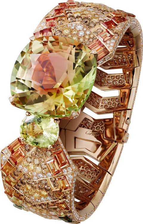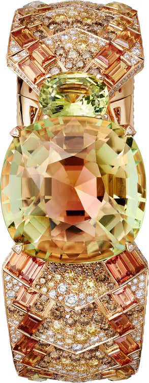 Bracelet - rose gold (750/1000), one 84.10-carat cushion-shaped watermelon tourmaline, one 8.01-carat cushion-shaped yellow green sapphire, baguette-cut colored sapphires, brown, light orange and white brilliant-cut diamonds.