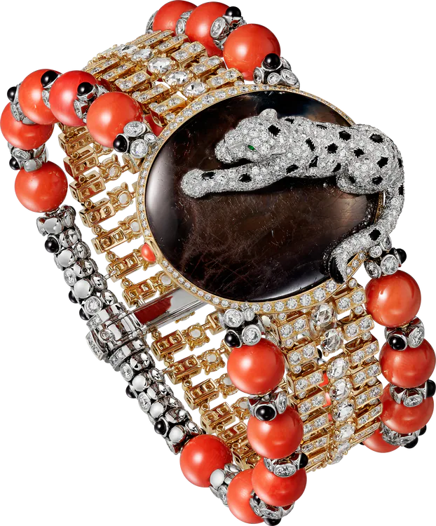 Bracelet - platinum, yellow gold, one 101.18-carat cabochon-cut brown star sapphire from Kenya, orangey-red coral beads, cabochon-cut coral, emerald eyes, onyx nose and spots, brilliant-cut diamonds.