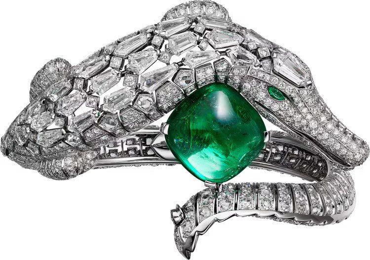 Bracelet - platinum, one 19.03-carat cushion-shaped cabochon-cut emerald from Zambia, one 0.83-carat G VS1 modified kite-shaped step-cut diamond, rose-cut diamonds, kite-shaped diamonds, pear-shaped emerald eyes, brilliant-cut diamonds.