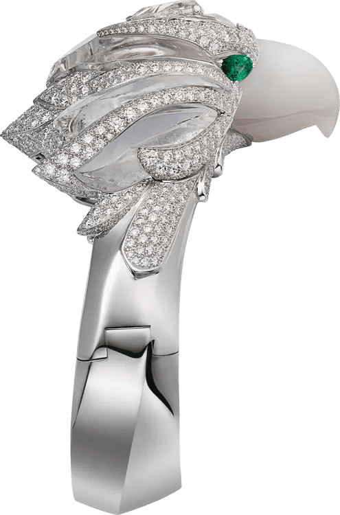 Bracelet - white gold (750/1000), one 3.08-carat pear-shaped diamond, carved rock crystal, agate, emerald eyes, brilliant-cut diamonds.