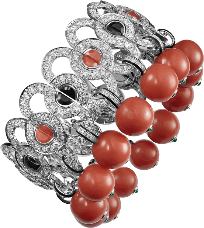 FLAMBOYANT Bracelet - platinum 950/1000, fourteen coral beads totaling 133.68 carats, coral, onyx, emeralds, brilliant-cut diamonds.