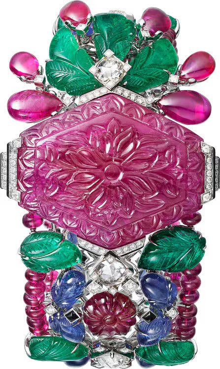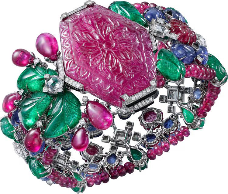 Bracelet - platinum, one 99.88-carat carved ruby from East Africa, six pear-shaped cabochon-cut rubies totaling 15.33 carats, seven E/G/H/I rose-cut diamonds totaling 4.66 carats, carved sapphires and emeralds, ruby beads, fluted rubies, onyx, brilliant-cut diamonds.