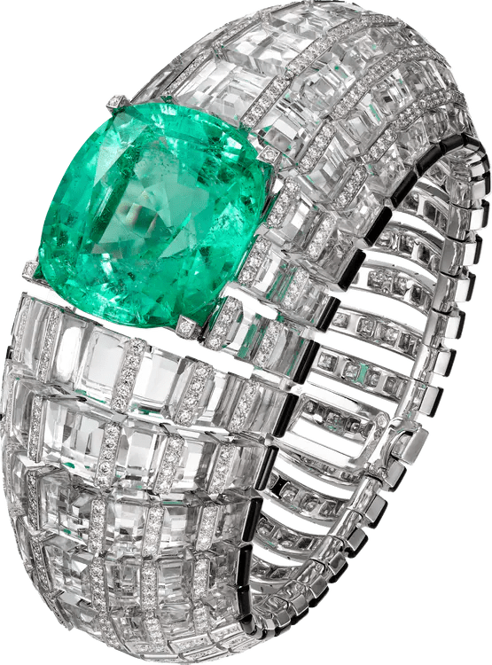 Bracelet - white gold (750/1000), one 66.09-carat cushion-shaped step-cut emerald from Colombia, rock crystal, onyx, brilliant-cut diamonds.