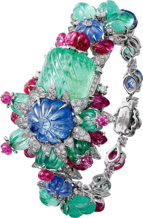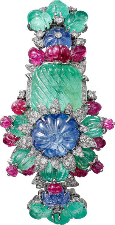 Bracelet - platinum, one 23.40-carat square-shaped carved emerald from Afghanistan, one 13.75-carat melon-cut sapphire bead from Burma, carved emeralds, rubies and sapphires, melon-cut ruby, emerald and sapphire beads, brilliant-cut diamonds.