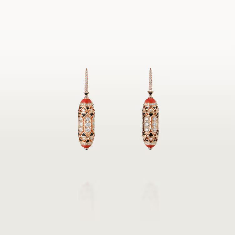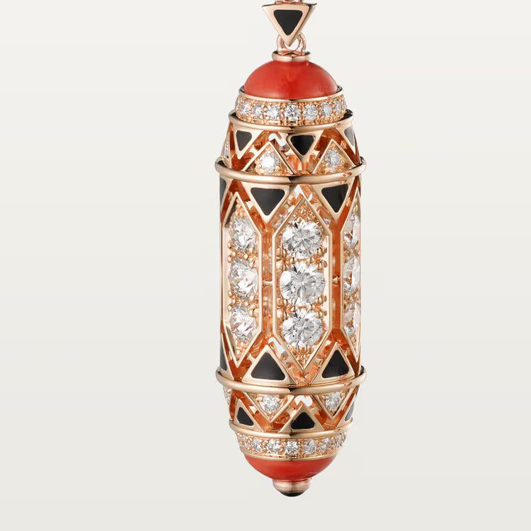 Art-Déco inspired ring, rose gold (750/1000), coral, onyx, black lacquer, each set with 76 brilliant-cut diamonds totaling 3.93 carats.
