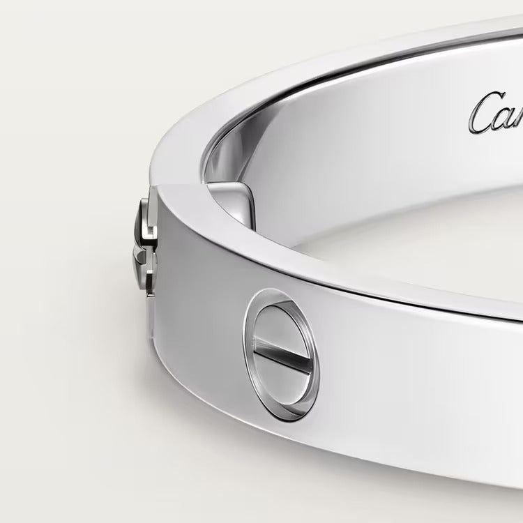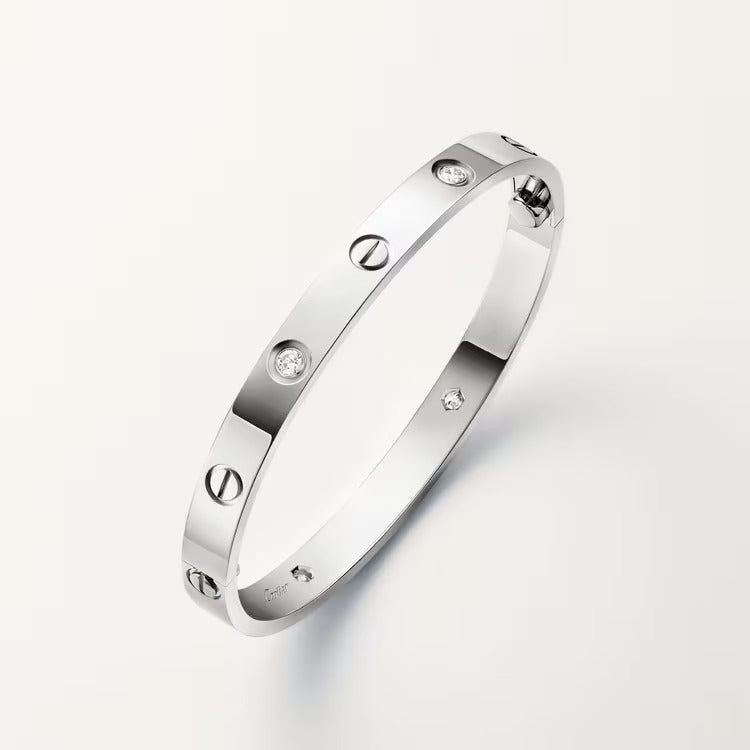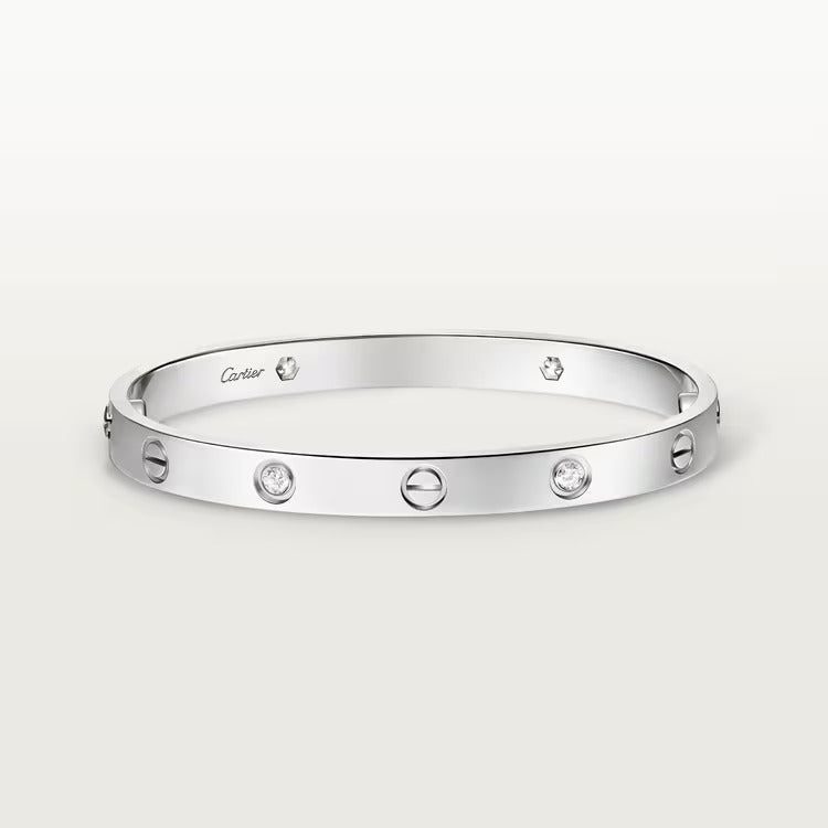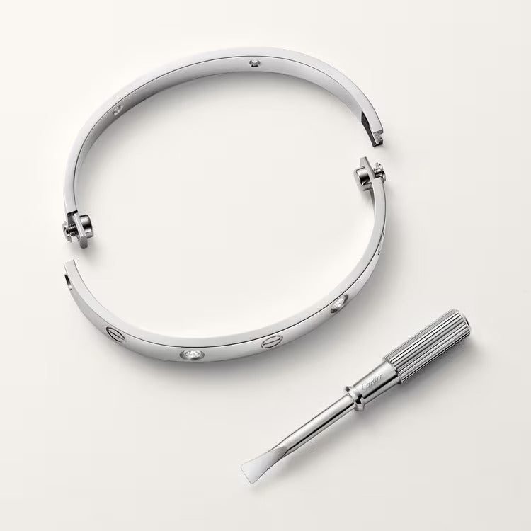 LOVE bracelet, classic model, 18K white gold (750/1000), set with 4 brilliant-cut diamonds totaling 0.42 carat, original fastening system with two functional screws. Comes with a screwdriver. Width 6.1 mm.   Created in New York in 1969, the LOVE bracelet is a jewelry design icon: a close fitting, oval bracelet composed of two rigid arcs, which is worn on the wrist and removed using a special screwdriver. The closure is designed with two functional screws placed on either side of the bracelet: you will need help to open or close it with the screwdriver.   To determine the size of your LOVE bracelet, measure your wrist, adding one centimeter to your size for a tighter fit, or two centimeters for a looser fit.