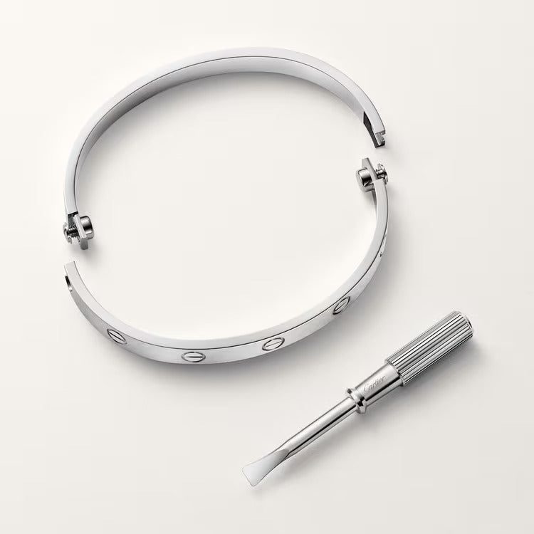 LOVE bracelet, classic model, 18K white gold (750/1000), brushed finish, original fastening system with two functional screws. Comes with a screwdriver. Width 6.1 mm. Created in New York in 1969, the LOVE bracelet is a jewelry design icon: a close fitting, oval bracelet composed of two rigid arcs, which is worn on the wrist and removed using a special screwdriver. The closure is designed with two functional screws placed on either side of the bracelet: you will need help to open or close it with the screwdriver. To determine the size of your LOVE bracelet, measure your wrist, adding one centimeter to your size for a tighter fit, or two centimeters for a looser fit.