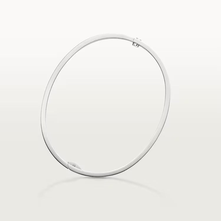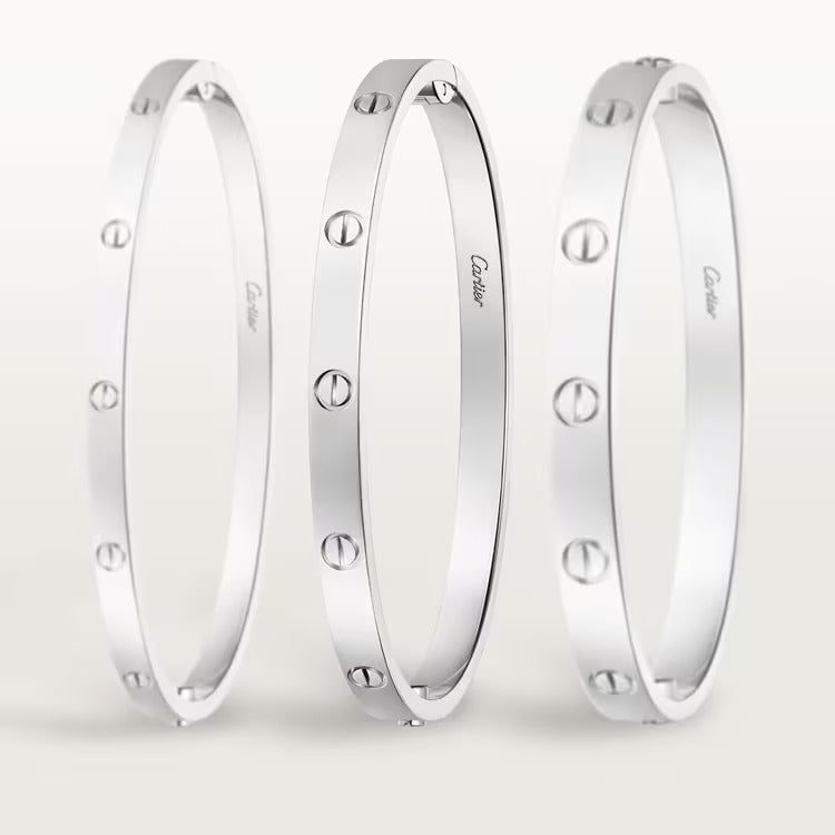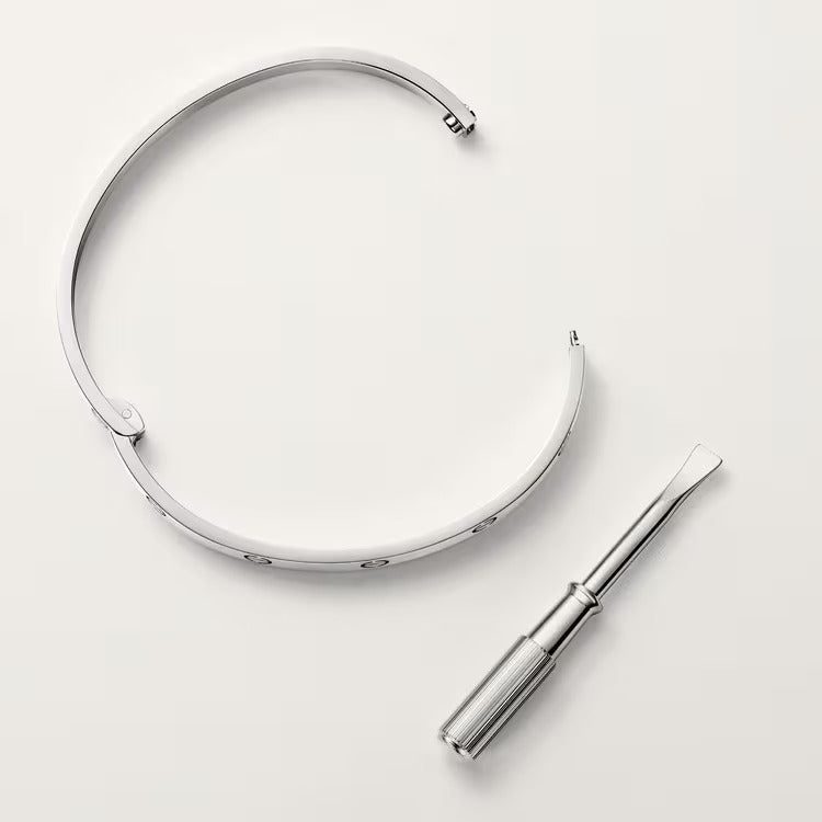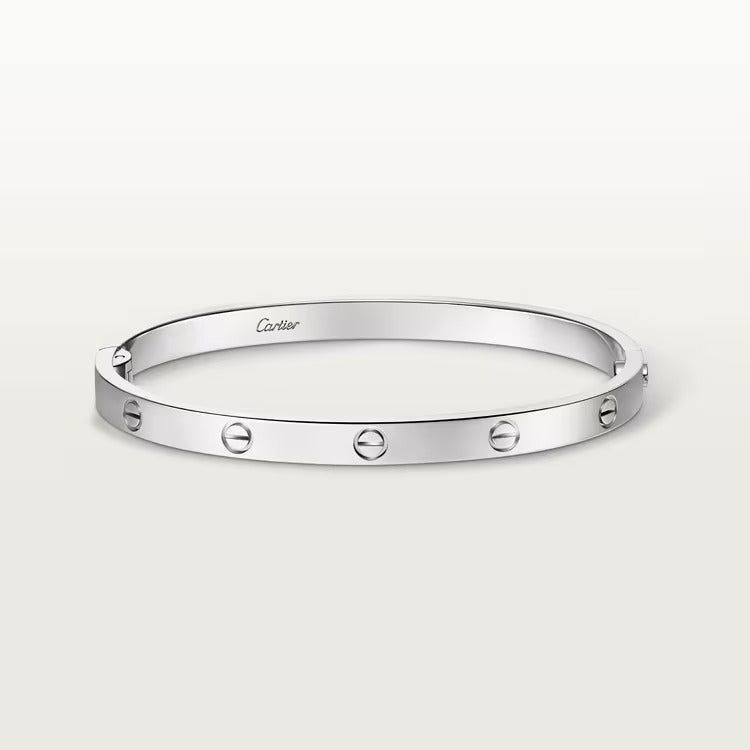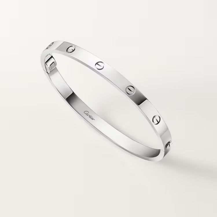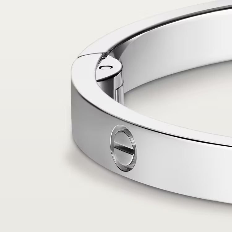 LOVE bracelet, medium model, 18K white gold (750/1000), closure system with functional screw and hinge. Comes with a screwdriver. Width 4.8 mm. Created in New York in 1969, the LOVE bracelet is a jewelry design icon: a close fitting, oval bracelet composed of two rigid arcs, which is worn on the wrist and removed using a special screwdriver. Cartier continues the story of the original LOVE bracelet with a version featuring a hinge and an intermediate width, between the small and classic models. Same design, same story: a timeless – yet slightly slimmer – creation which is fastened using a screwdriver. On this model, the closing system consists of a functional screw on one side of the bracelet and a hinge on the other, enabling it to be put on and taken off by itself with the help of a screwdriver. To determine the size of your LOVE bracelet, measure your wrist, adding one centimeter to your size for a tighter fit, or two centimeters for a looser fit.