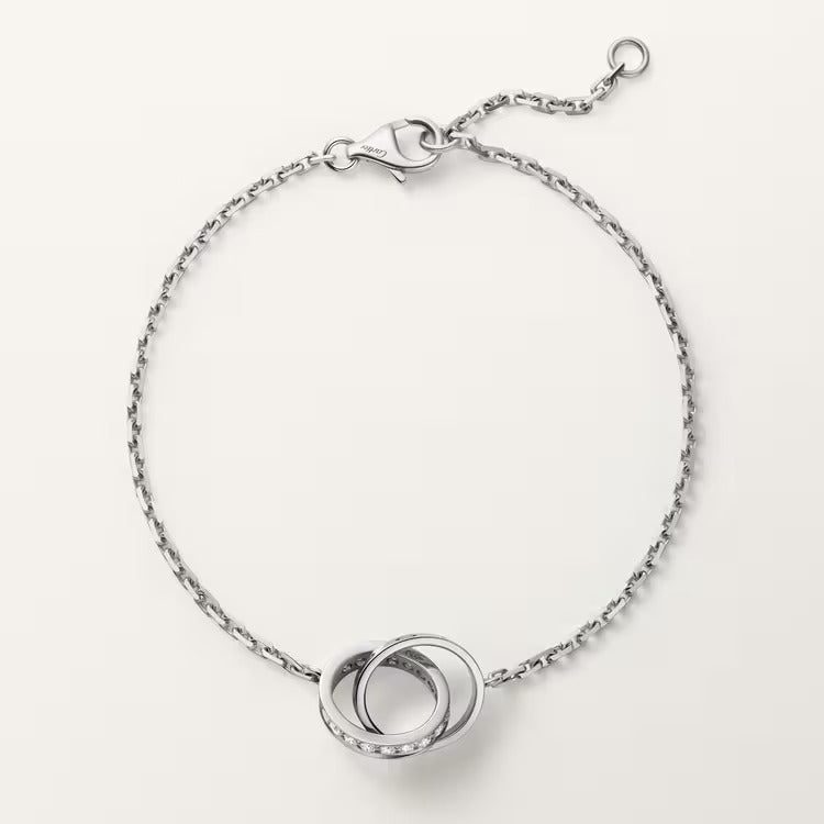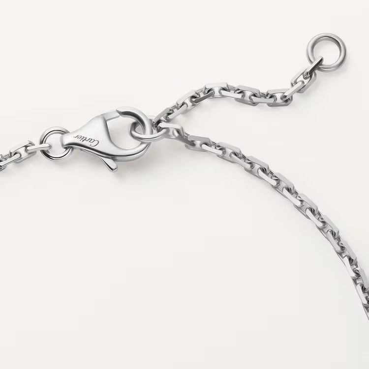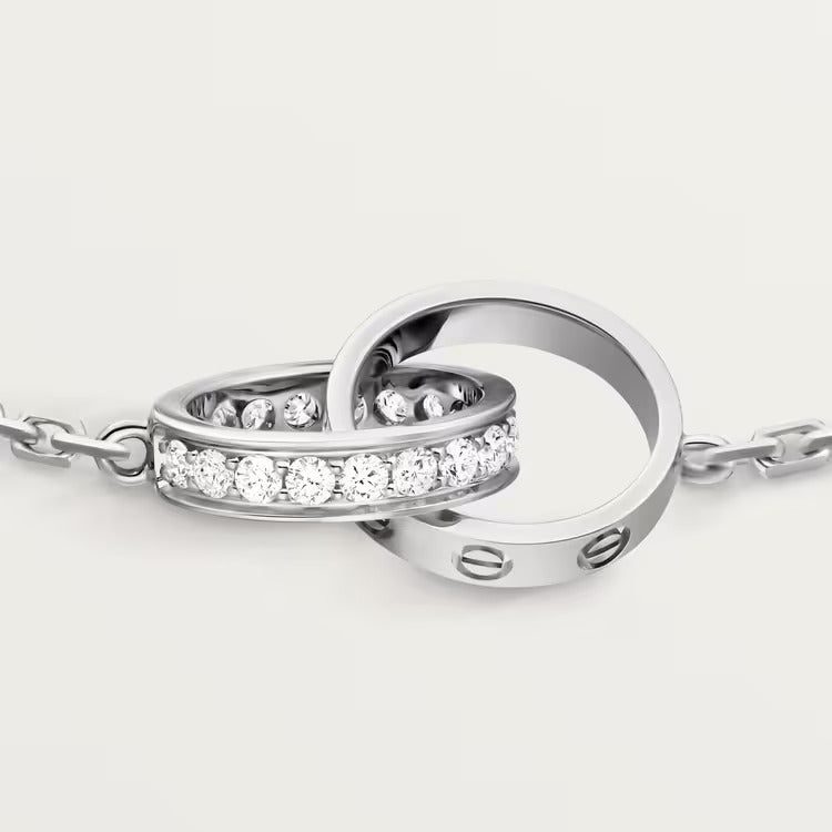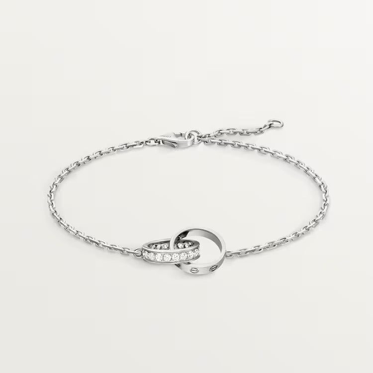 LOVE bracelet, 18K white gold (750/1000), set with 18 brilliant-cut diamonds totaling 0.22 carat. Width: 2.65 mm. Inner diameter: 7.6 mm. Adjustable chain length: 160-180 mm.