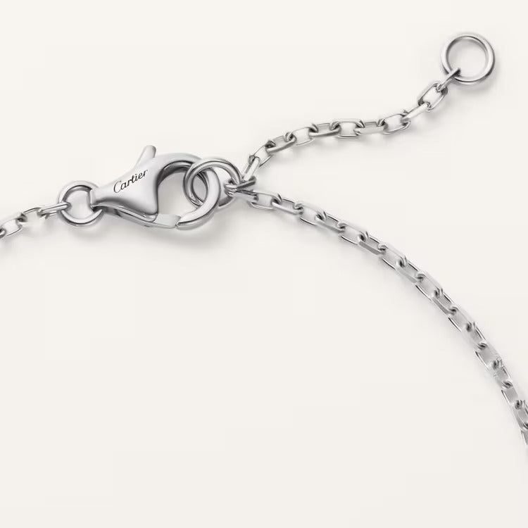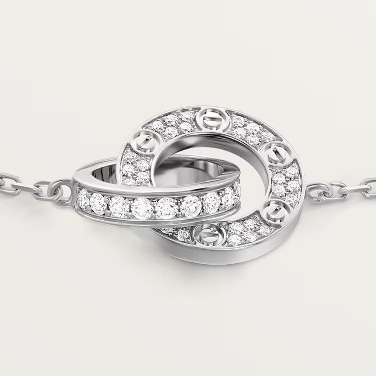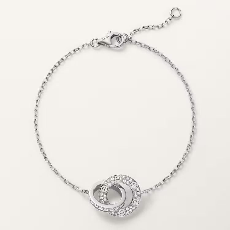 LOVE bracelet, 18K white gold (750/1000), set with 48 brilliant-cut diamonds totaling 0.30 carat. Width: 2.65 mm. Inner diameter: 7.6 mm. Adjustable chain length: 160-180 mm.