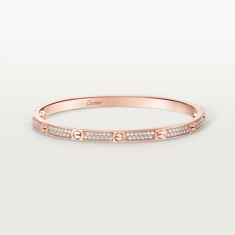 LOVE bracelet, small model, 18K rose gold (750/1000), set with 177 brilliant-cut diamonds totaling 0.95 carat, fastening system with functional screw and hinge. Comes with a screwdriver. Width: 3.65 mm (for size 17).   Created in New York in 1969, the LOVE bracelet is an icon of jewelry design: an oval bracelet, composed of two rigid arches, that is worn tightly around the wrist and removed with a special screwdriver.   Cartier continues the story of the original LOVE bracelet with a slimmer version featuring a hinge. Same design, same story: a timeless – yet slightly slimmer – creation which is fastened using a screwdriver. On this model, the closing system consists of a functional screw on one side of the bracelet and a hinge on the other, enabling it to be put on and taken off by itself with the help of a screwdriver.   To determine the size of your LOVE bracelet, measure your wrist, adding one centimeter to your size for a tighter fit, or two centimeters for a looser fit.