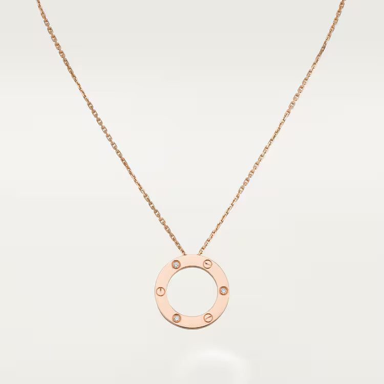 LOVE necklace, 18K rose gold (750/1000), set with 3 brilliant-cut diamonds totaling 0.07 carats. Inner diameter 16mm. Chain length: 420mm.