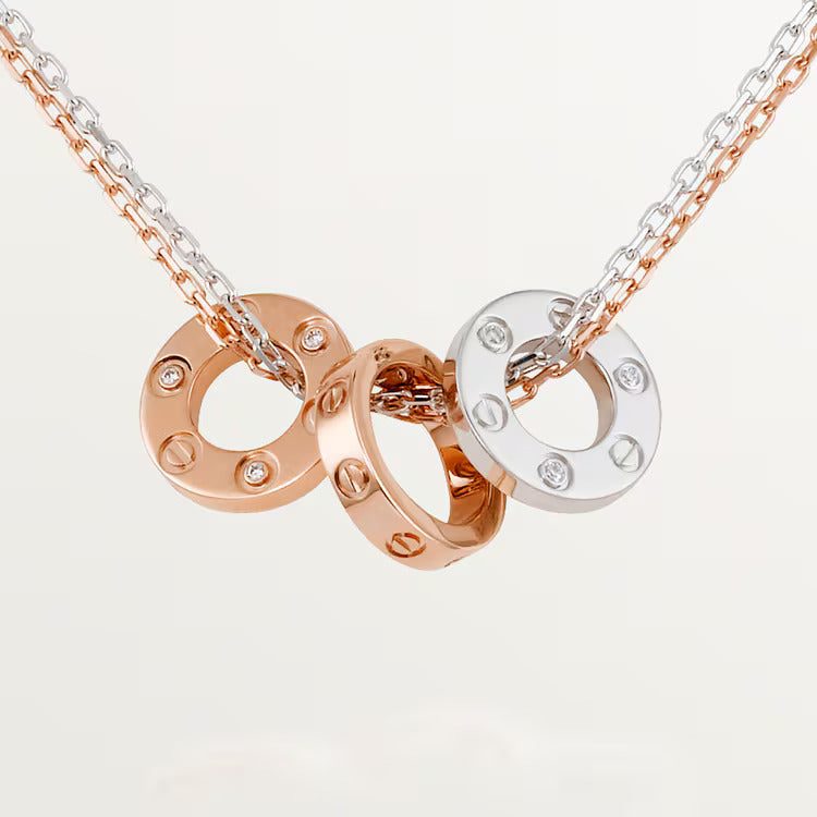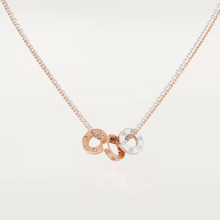 LOVE necklace, 18K rose gold (750/1000), 18K white gold (750/1000), set with 6 brilliant-cut diamonds totaling 0.01 carats. Mini circle inner diameter: 5.6mm Baby love inner diameter: 8mm Chain length: 370mm.