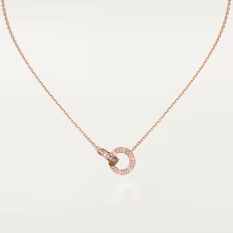 LOVE necklace, 18K rose gold (750/1000), set with 48 brilliant-cut diamonds totaling 0.30 carats. Width: 2.65 mm. Inner diameter: 7.6 mm. Adjustable chain length: 380-410 mm.