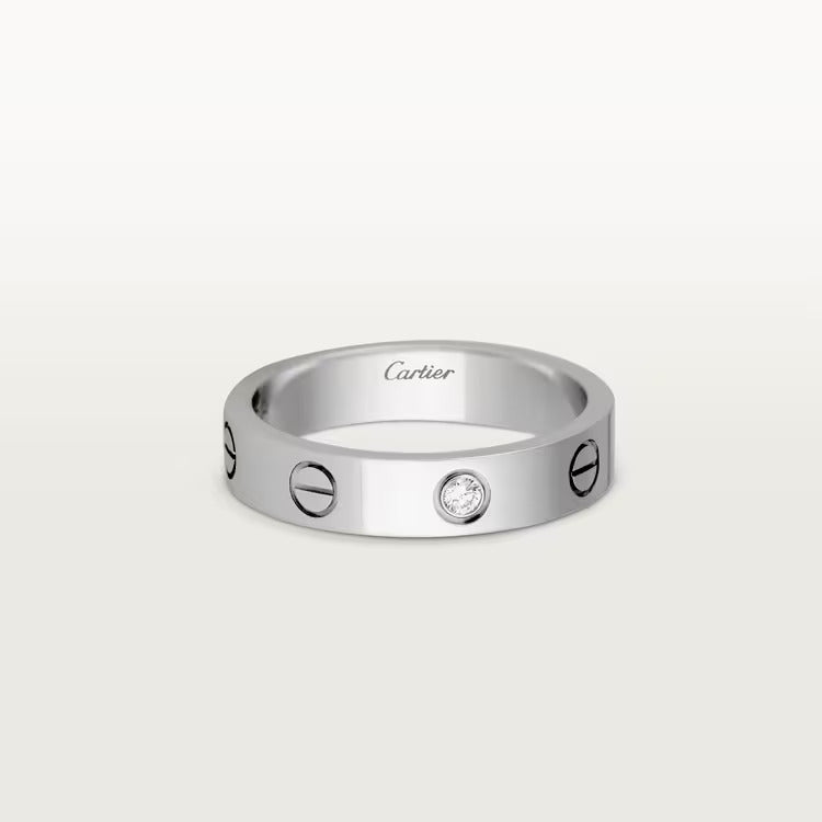 LOVE wedding band, 18K white gold (750/1000), set with 1 brilliant-cut diamond totaling 0.02 carats. Width: 4 mm (for size 52).