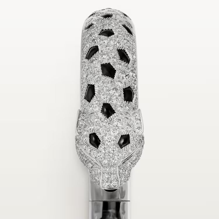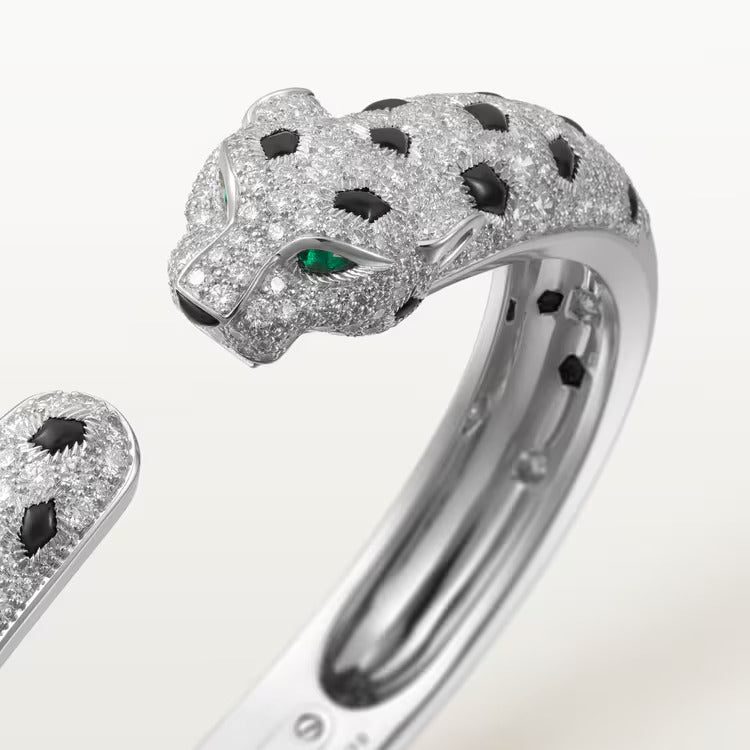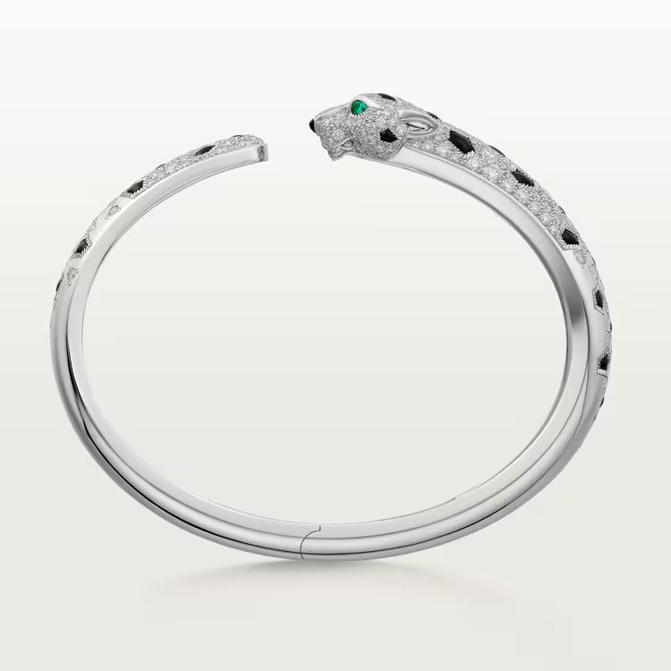 Panthère de Cartier bracelet, 18K white gold (750/1000), onyx, set with 2 emeralds and 225 brilliant-cut diamonds totaling 2.55 carats. Width: 8.33 mm. Thickness: 4.7 mm (for size 17).